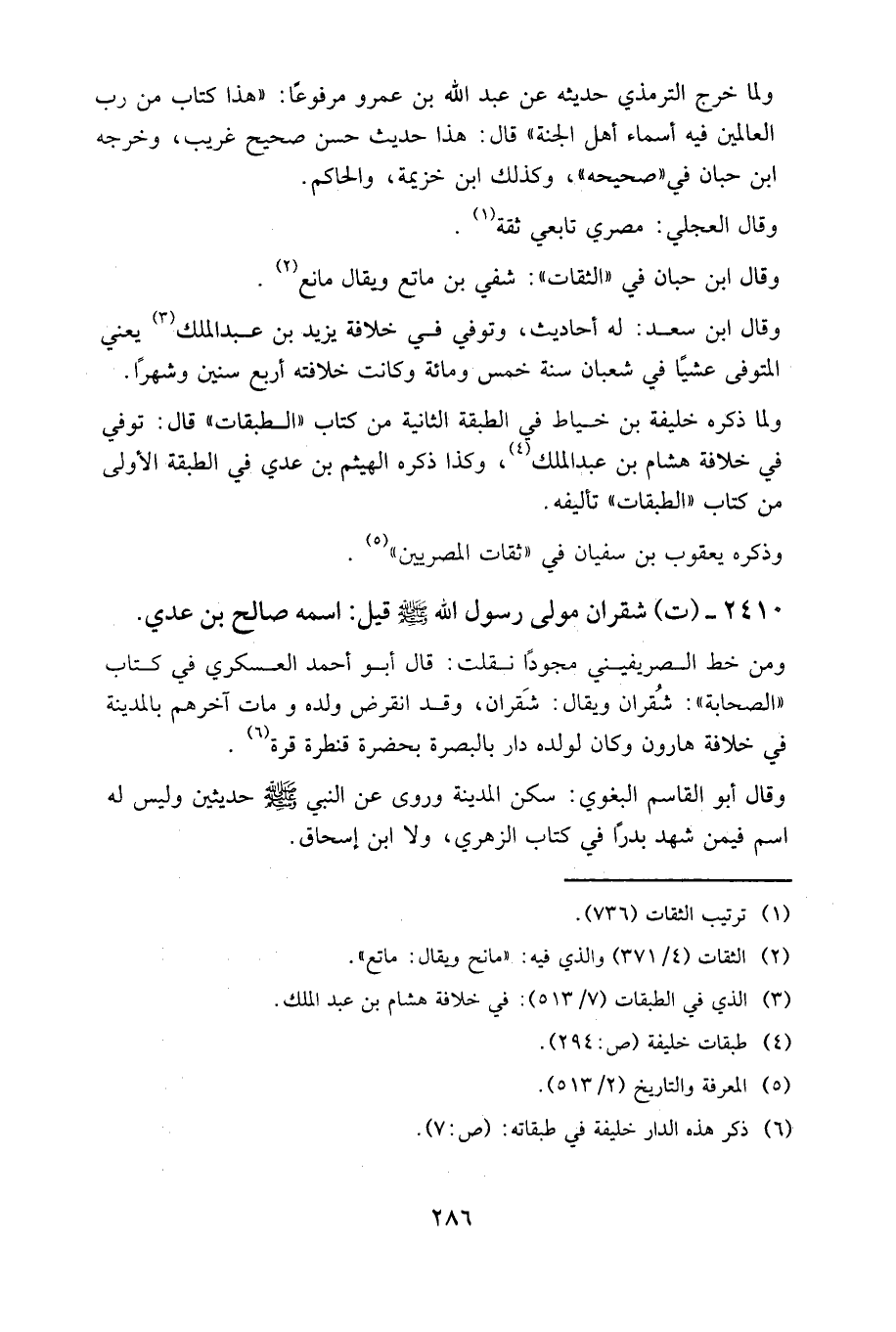 2410- (ت) شقران مولى رسول الله صلى الله عليه وسلم قيل: اسمه صالح بن عدي.