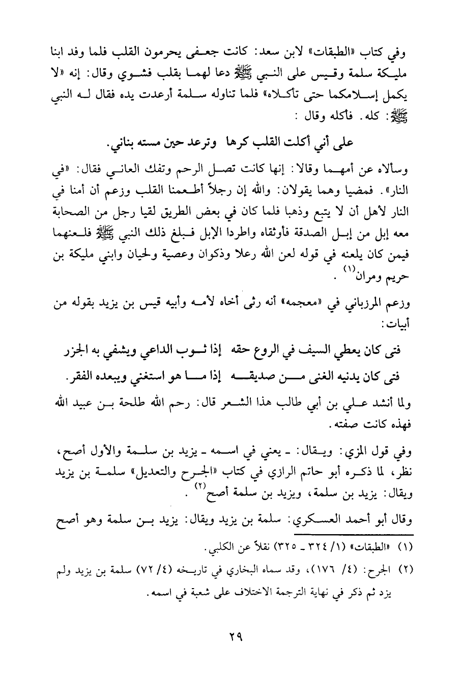 وفي كتاب "الطبقات" لابن سعد: كانت جعفى يحرمون القلب فلما وفد ابنا مليكة سلمة وقيس على النبي صلى الله عليه وسلم دعا لهما بقلب فشوي وقال: إنه "لا يكمل إسلامكما حتى تأكلاه" فلما تناوله سلمة أرعدت يده فقال له النبي صلى الله عليه وسلم: كله. فأكله وقال: