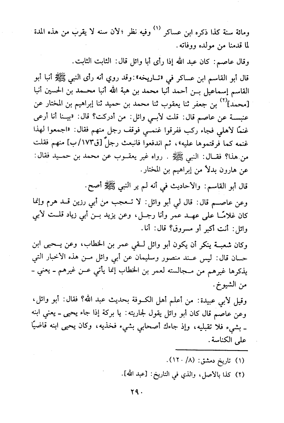 قال أبو القاسم بن عساكر في "تاريخه": وقد روي أنه رأى النبي صلى الله عليه وسلم أنبأ أبو القاسم إسماعيل بن أحمد أنبأ محمد بن هبة الله، أنبأ محمد بن الحسين أنبأ (محمد) بن جعفر حَدَّثنا يعقوب حَدَّثنا محمد بن حميد، حَدَّثنا إبراهيم بن المختار عن عنبسة عن عاصم قال: قلت لأبي وائل: من أدركت؟ قال: "بينا أنا أرعى غنما لأهلي فجاء ركب ففرقوا غنمي فوقف رجل منهم فقال: "اجمعوا لهذا غنمه كما فرقتموها عليه"، ثم اندفعوا فانبعث رجل منهم فقلت من هذا؟ فقال: النبي صلى الله عليه وسلم. رواه غير يعقوب عن محمد بن حميد فقال: عن هارون بدلا من إبراهيم بن المختار.