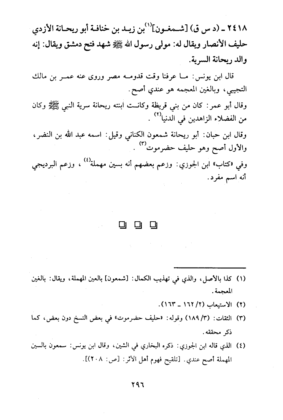 2418- (د س ق) (شمغون) بن زيد بن خنافة أبو ريحانة الأزدي حليف الأنصار ويقال له: مولى رسول الله صلى الله عليه وسلم شهد فتح دمشق ويقال: إنه والد ريحانة السرية.
