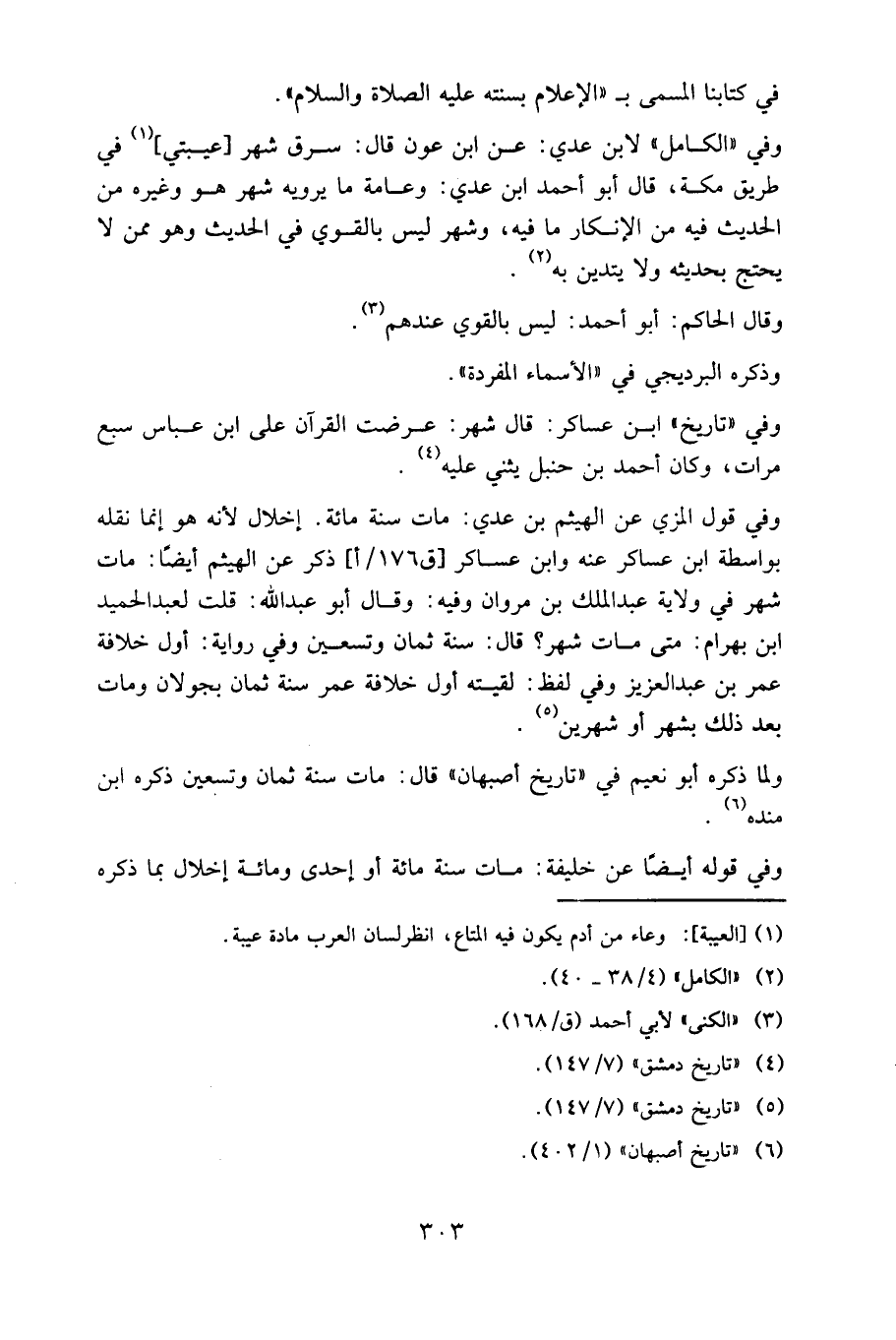 وفي قول المزي عن الهيثم بن عدي: مات سنة مِائَة. إخلال لأنه هو إنما نقله بواسطة ابن عساكر عنه وابن عساكر ذكر عن الهيثم أيضا: مات شهر في ولاية عبد الملك بن مروان وفيه: وقال أبو عبد الله: قلت لعبد الحميد بن بهرام: متى مات شهر؟ قال: سنة ثمان وتسعين وفي رواية: أول خلافة عمر بن عبد العزيز وفي لفظ: لقيته أول خلافة عمر سنة ثمان بجولان ومات بعد ذلك بشهر أو شهرين.