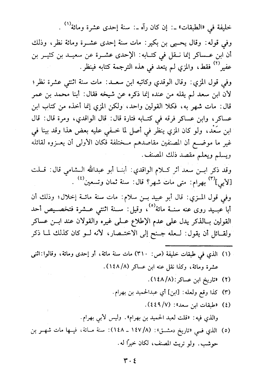 وفي قول المزي: وقال الواقدي وكاتبه ابن سعد: مات سنة اثنتي عشرة نظر؛ لأن ابن سعد لم يقله من عنده إنما ذكره عن شيخه فقال: أنبأنا محمد بن عمر قال: مات شهر به، فكلا القولين واحد، ولكن المزي إنما أخذه من كتاب ابن عساكر، وابن عساكر فرقه في كتابه فتارة قال: قال الواقدي، ومرة قال: قال ابن سعد، ولو كان المزي ينظر في أصل لما خفي عليه بعض هذا، وقد بينا في غير ما موضع أن المصنفين مقاصدهم مختلفة، فكان الأولى أن يعزوه لقائله ويسلم ويعلم مقصد ذلك المصنف.