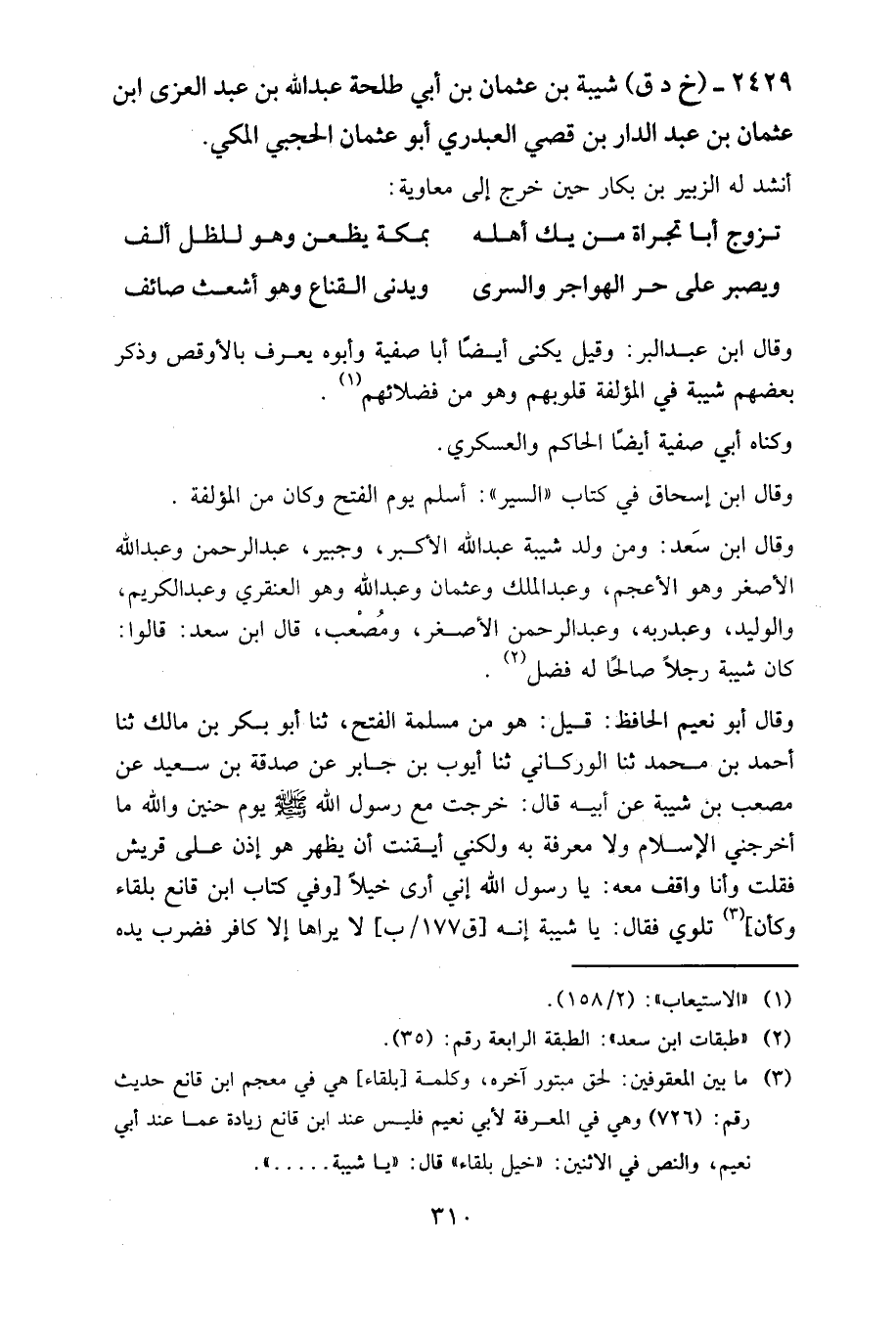 2429- (خ د ق) شيبة بن عثمان بن أبي طلحة عبد الله بن عبد العزى بن عثمان بن عبد الدار بن قصي العبدري أبو عثمان الحجبي المكي.
