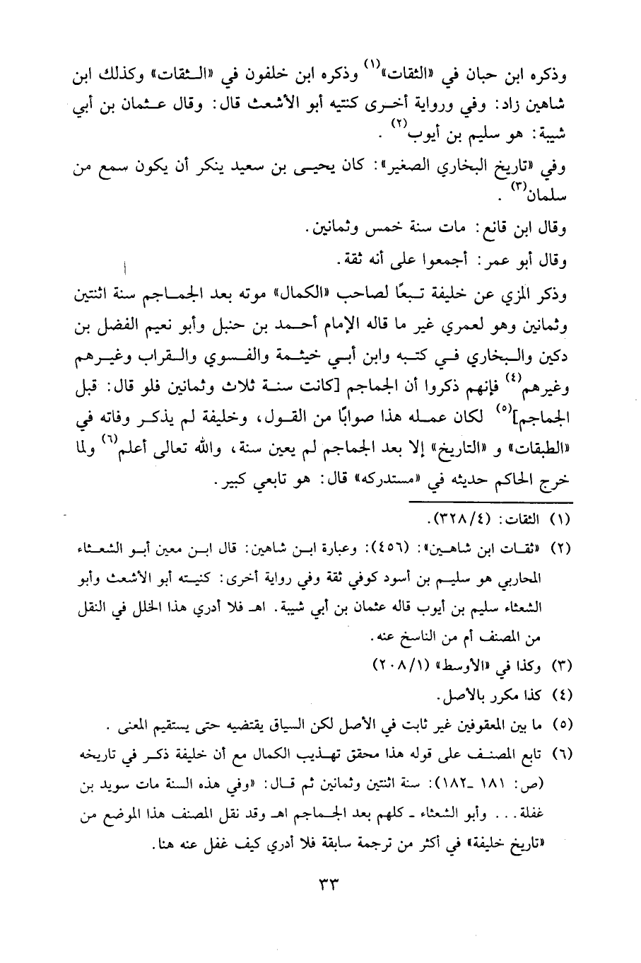 وذكر المزي عن خليفة تبعا لصاحب "الكمال" موته بعد الجماجم سنة اثنين وثمانين وهو لعمري غير ما قاله الإمام أحمد بن حنبل وأبو نعيم الفضل بن دكين والبخاري في كتبه وابن أبي خيثمة والفسوي والقراب وغيرهم، فإنهم ذكروا أن الجماجم كانت سنة ثلاث وثمانين، فلو قال: قبل الجماجم لكان عمله هذا صوابا من القول، وخليفة لم يذكر وفاته في "الطبقات" و "التاريخ" إلا بعد الجماجم لم يعين سنة، والله تعالى أعلم، ولما خرج الحاكم حديثه في "مستدركه" قال: هو تابعي كبير.