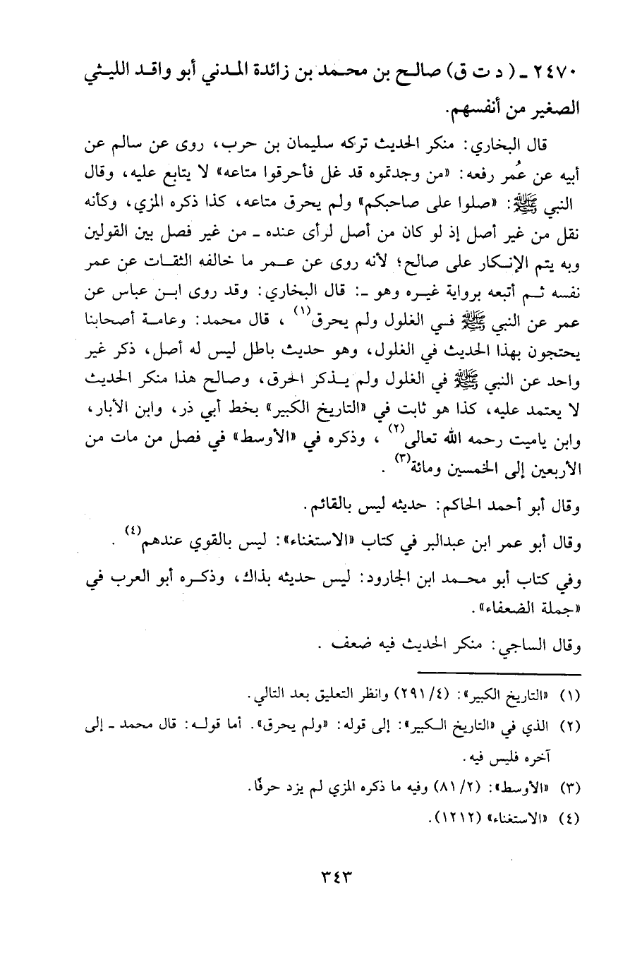 روى عن سالم عن أبيه عن عمر رفعه: "من وجدتموه قد غل فأحرقوا متاعه" لا يتابع عليه، وقال النبي صلى الله عليه وسلم: "صلوا على صاحبكم" ولم يحرق متاعه، كذا ذكره المزي، وكأنه نقل من غير أصل إذ لو كان من أصل لرأى عنده من غير فصل بين القولين وبه يتم الإنكار على صالح؛ لأنه روى عن عمر ما خالفه الثقات عن عمر نفسه ثم أتبعه برواية غيره وهو: قال البخاري: وقد روى ابن عباس عن عمر عن النبي صلى الله عليه وسلم في الغلول ولم يحرق، قال محمد: وعامة أصحابنا يحتجون بهذا الحديث في الغلول، وهو حديث باطل ليس له أصل، ذكر غير واحد عن النبي صلى الله عليه وسلم في الغلول ولم يذكر الحرق، وصالح هذا منكر الحديث لا يعتمد عليه، كذا هو ثابت في "التاريخ الكبير" بخط أبي ذر، وابن الأبار، وابن ياميت رحمه الله تعالى، وذكره في "الأوسط" في فصل من مات من الأربعين إلى الخمسين ومِائَة.