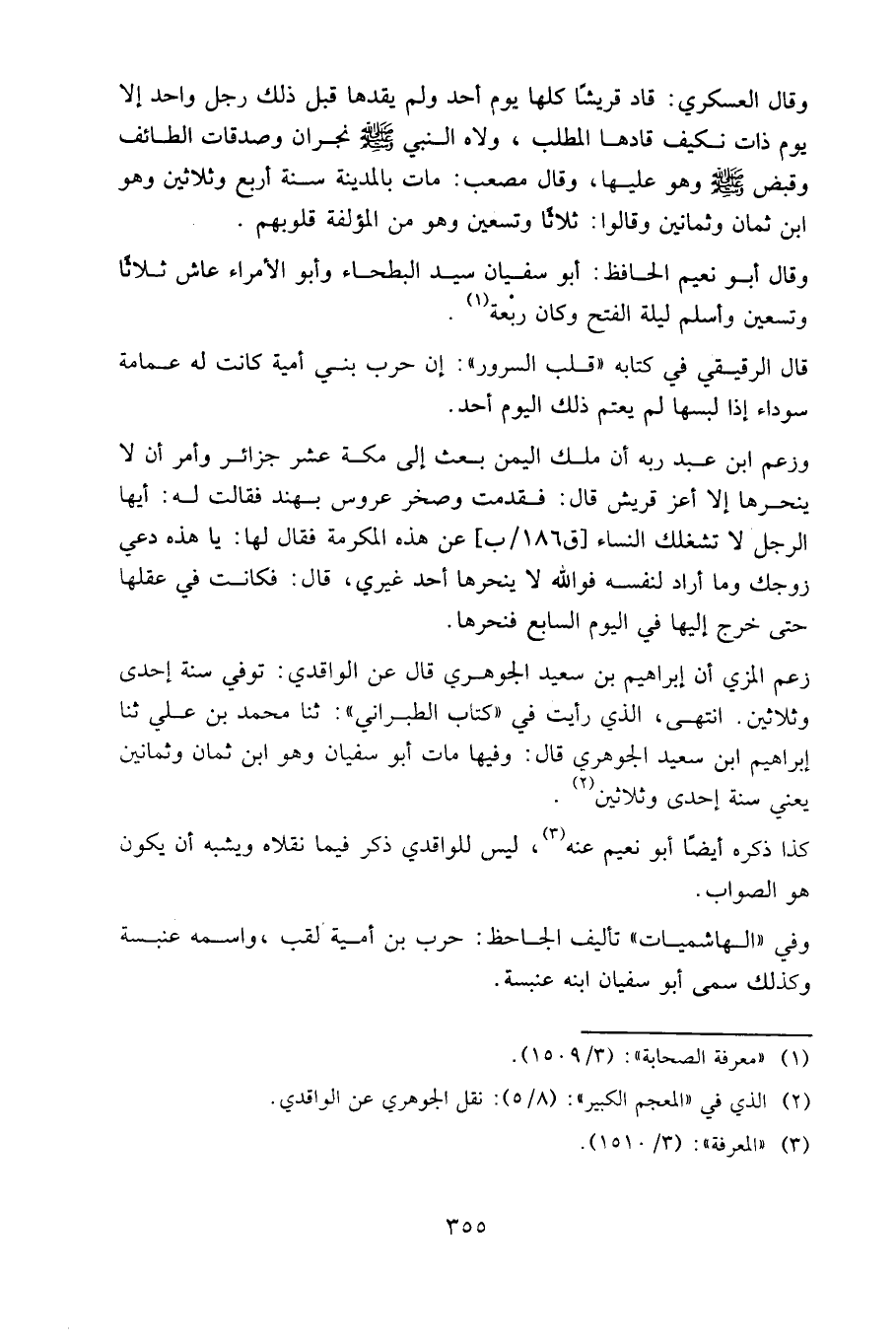زعم المزي أن إبراهيم بن سعيد الجوهري قال عن الواقدي: توفي سنة إحدى وثلاثين. انتهى، الذي رأيت في "كتاب الطبراني": حَدَّثنا محمد بن علي حَدَّثنا إبراهيم بن سعيد الجوهري قال: وفيها مات أبو سفيان وهو ابن ثمان وثمانين يعني سنة إحدى وثلاثين.