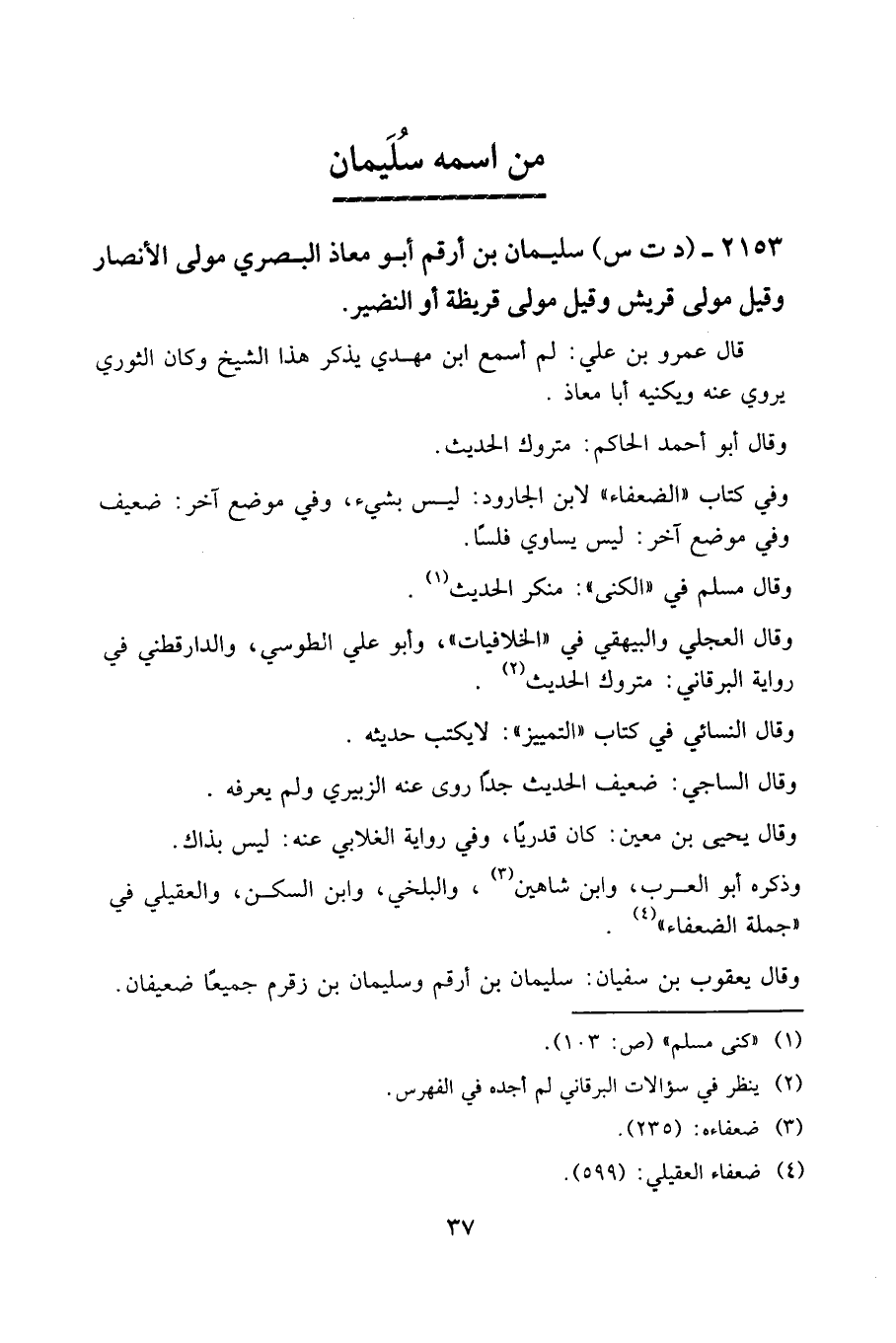 2153 - (د ت س) سليمان بن أرقم أبو معاذ البصري مولى الأنصار وقيل مولى قريش وقيل مولى قريظة أو النضير.