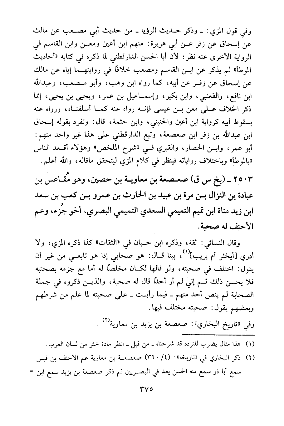 وفي قول المزي: وذكر حديث الرؤيا من حديث أبي مصعب عن مالك عن إسحاق عن زفر عن أبي هريرة: منهم ابن أعين ومعن وابن القاسم في الرواية الأخرى عنه نظر؛ لأن أبا الحسن الدارقطني لما ذكره في كتابه "أحاديث الموطأ" لم يذكر عن ابن القاسم ومصعب خلافا في روايتهما إياه عن مالك عن إسحاق عن زفر عن أبيه، كما رواه ابن وهب، وأبو مصعب، وعبد الله بن نافع، والقعنبي، وابن بكير، وإسماعيل بن عمر، ويحيى بن يحيى، إنما ذكر الخلاف على معن بن عيسى فإنه رواه عنه كما أسلفناه، ورواه عنه بسقوط أبيه كرواية ابن أعين والحنيني، وابن حثمة، قال: وتفرد بقوله إسحاق بن عبد الله بن زفر بن صعصعة، وتبع الدارقطني على هذا غير واحد منهم: أبو عمر، وابن الحصار، والقبري في "شرح الملخص" وهؤلاء أقعد الناس "بالموطأ" وباختلاف رواياته فينظر في كلام المزي ليتحقق ما قاله، والله أعلم.