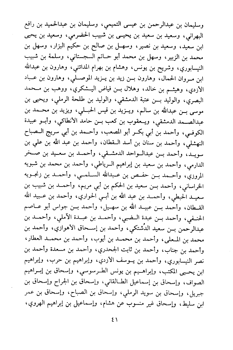 وسليمان بن عبد الرحمن بن عيسى التميمي، وسليمان بن عبد الحميد بن رافع البهراني، وسعيد بن سعيد بن يحيى بن شبيب الحضرمي، وسعيد بن يحيى بن سعيد، وسعيد بن نصير، وسهل بن صالح بن حكيم البزار، وسهل بن محمد بن الزبير، وسهل بن محمد أبو حاتم السجستاني، وسلمة بن شبيب النيسابوري، وشريح بن يونس، وهشام بن بهرام المدائني، وهارون بن عبد الله بن مروان الحمال، وهارون بن زيد بن يزيد الموصلي، وهارون بن عباد الأزدي، وهيثم بن خالد، وهلال بن فياض اليشكري، ووهب بن محمد البصري، والوليد بن عتبة الدمشقي، والوليد بن طلحة الرملي، ويحيى بن موسى بن عبد الله بن سالم، ويزيد بن قيس الحبلي، ويزيد بن محمد بن عبد الصمد الدمشقي، ويعقوب بن كعب بن حامد الأنطاكي، وأبو عبيدة الكوفي، وأحمد بن أبي بكر أبو المصعب، وأحمد بن أبي سريج الصباح النهشلي، وأحمد بن سنان بن أسد القطان، وأحمد بن عبد الله بن علي بن سويد، وأحمد بن عبد الواحد الدمشقي، وأحمد بن سعيد بن صخر الدارمي، وأحمد بن سعيد بن إبراهيم الرباطي، وأحمد بن محمد بن شبويه المروزي، وأحمد بن حفص بن عبد الله السلمي، وأحمد بن زنجويه الخراساني، وأحمد بن سعيد بن الحكم بن أبي مريم، وأحمد بن شبيب بن سعيد الحبطي، وأحمد بن عبد الله بن أبي الحواري، وأحمد بن عبيد الله القطان، وأحمد بن عبيد الله بن سهيل، وأحمد بن جواس أبو عاصم الحنفي، وأحمد بن عبدة الضبي، وأحمد بن عبدة الآملي، وأحمد بن عبد الرحمن بن سعيد الدشتكي، وأحمد بن إسحاق الأهوازي، وأحمد بن محمد بن المعلى، وأحمد بن محمد بن أيوب، وأحمد بن محمد العطار، وأحمد بن جناب، وأحمد بن ثابت الجحدري، وأحمد بن مسعدة وأحمد بن نصر النيسابوري، وأحمد بن يوسف الأزدي، وإبراهيم بن حرب، وإبراهيم بن يحيى المكتب، وإبراهيم بن يونس الطرسوسي، وإسحاق بن إبراهيم الصواف، وإسحاق بن إسماعيل الطالقاني، وإسحاق بن الجراح وإسحاق بن جبريل، وإسحاق بن سويد الرملي، وإسحاق بن الصباح، وإسحاق بن عمر بن سليط، وإسحاق غير منسوب عن هشام، وإسماعيل بن إبراهيم الهروي،