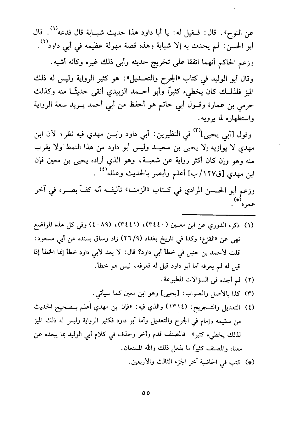 وقول (أبي يحيى) في النظيرين: أبي داود وابن مهدي فيه نظر؛ لأن ابن مهدي لا يوازيه إلا يحيى بن سعيد، وليس أبو داود من هذا النمط ولا يقرب منه، وهو وإن كان أكثر رواية عن شعبة، وهو الذي أراده يحيى بن معين فإن ابن مهدي أعلم وأبصر بالحديث وعلله.