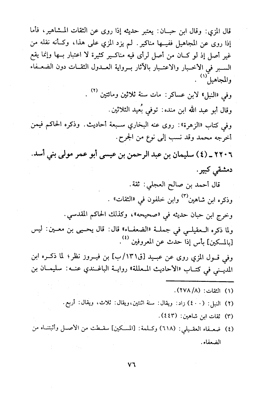 قال المزي: وقال ابن حبان: يعتبر حديثه إذا روى عن الثقات المشاهير، فأما إذا روى عن المجاهيل ففيها مناكير. لم يزد المزي على هذا، وكأنه نقله من غير أصل إذ لو كان من أصل لرأى فيه مناكير كثيرة لا اعتبار بها، وإنما يقع السبر في الأخبار والاعتبار بالآثار برواية العدول الثقات دون الضعفاء والمجاهيل.