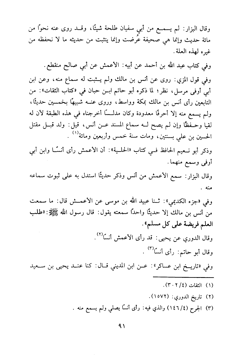وفي "جزء الكديمي": حَدَّثنا عبيد الله بن موسى عن الأعمش قال: ما سمعت من أنس بن مالك إلا حديثا واحدا سمعته يقول: قال رسول الله صلى الله عليه وسلم: "طلب العلم فريضة على كل مسلم".