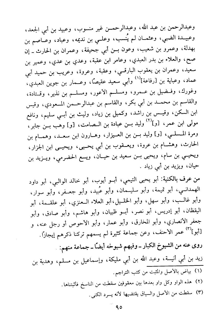 من عرف بالكنية: أبو يحيى التيمي، أبو أيوب، أبو خالد الوالبي، أبو داود الهمداني، أبو تميمة، وأبو سليمان، وأبو عبيد، وأبو جعفر، وأبو سوار، وأبو غالب، وأبو سهل، وأبو الخليل، أبو العلاء العنزي، أبو علقمة، أبو اليقظان، أبو إدريس، أبو نصر، أبو ظبيان، وأبو هاشم، وأبو صادق، وأبو جعفر الأنصاري، وأبو المخارق، وأبو عمار، وأبو الأحوص أو رجل عنه، و (أبو) عمر الأحنف، وعن جماعة كثيرة لهم يسمهم تركنا ذكرهم إيجازا.