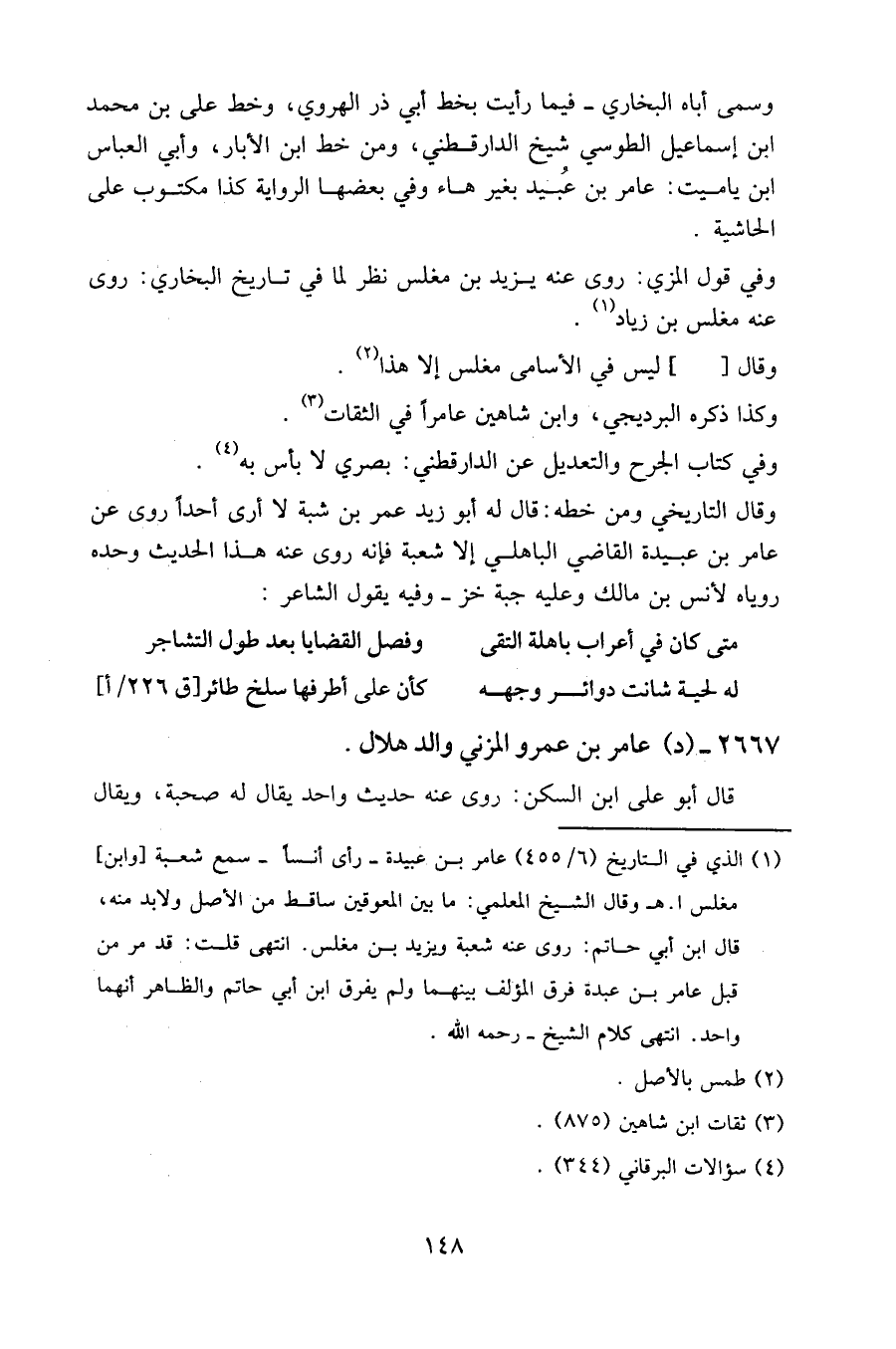 وسمى أباه البخاري فيما رأيت بخط أبي ذر الهروي، وخط علي بن محمد بن إسماعيل الطوسي شيخ الدارقطني، ومن خط ابن الأبار، وأبي العباس بن ياميت: عامر بن عبيد بغير هاء وفي بعضها الرواية كذا مكتوب على الحاشية.