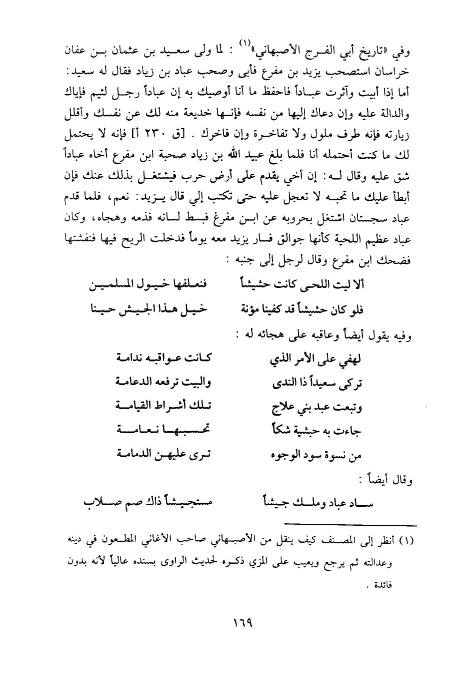 وفي "تاريخ أبي الفرج الأصبهاني ": لما ولي سعيد بن عثمان بن عفان خراسان استصحب يزيد بن مفرع فأبى وصحب عباد بن زياد فقال له سعيد: أما إذا أبيت وآثرت عبادا فاحفظ ما أنا أوصيك به إن عبادا رجل لئيم فإياك والدالة عليه وإن دعاك إليها من نفسه فإنها خديعة منه لك عن نفسك وأقلل زيارته فإنه طرف ملول ولا تفاخره وإن فاخرك. [ق 230 أ] فإنه لا يحتمل لك ما كنت أحتمله أنا فلما بلغ عبيد الله بن زياد صحبة ابن مفرع أخاه عبادا شق عليه وقال له: إن أخي يقدم على أرض حرب فيشتغل بذلك عنك فإن أبطأ عليك ما تحبه لا تعجل عليه حتى تكتب إلي قال يزيد: نعم، فلما قدم عباد سجستان اشتغل بحروبه عن ابن مفرغ فبسط لسانه فذمه وهجاه، وكان عباد عظيم اللحية كأنها جوالق فسار يزيد معه يوما فدخلت الريح فيها فنفشتها فضحك ابن مفرع وقال لرجل إلى جنبه: