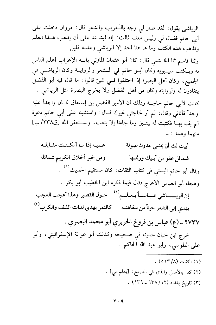 وحدثنا قاسم حَدَّثنا الخشني قال: كان أبو عثمان المازني بابه الإعراب أعلم الناس به ويكتب سيبويه وكان أبو حاتم في الشعر والرواية وكان الرياشي في الجميع، وكان أهل البصرة إذا اختلفوا في شيء قالوا: ما قال فيه أبو الفضل ينقادون له ولروايته وكان من أهل الفضل ولا يخرج البصرة مثل الرياشي.