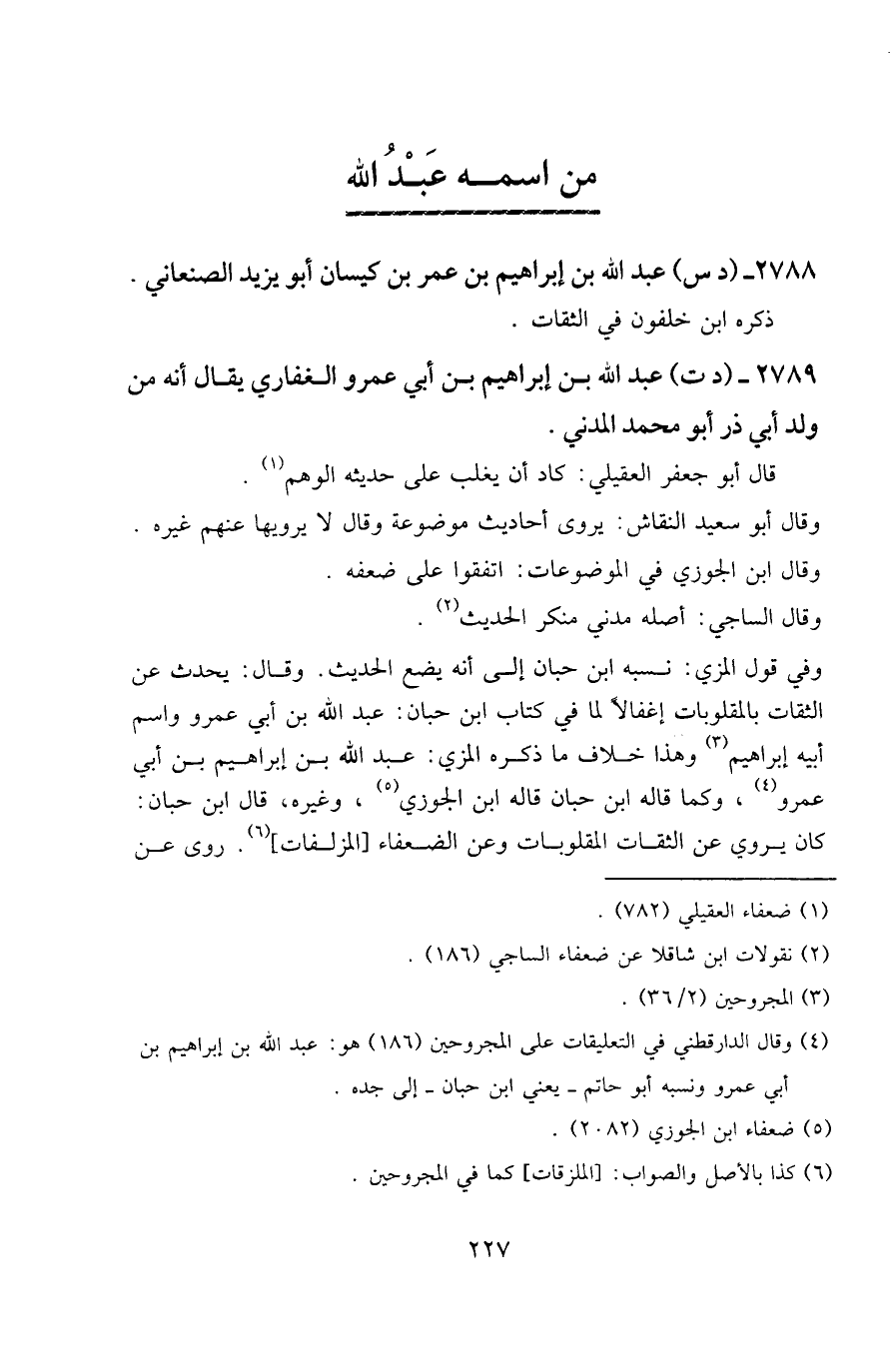وفي قول المزي: نسبه ابن حبان إلى أنه يضع الحديث، وقال: يحدث عن الثقات بالمقلوبات إغفالا لما في كتاب ابن حبان: عبد الله بن أبي عَمرو واسم أبيه إبراهيم وهذا خلاف ما ذكره المزي: عبد الله بن إبراهيم بن أبي عمرو، وكما قاله ابن حبان قاله ابن الجوزي، وغيره.