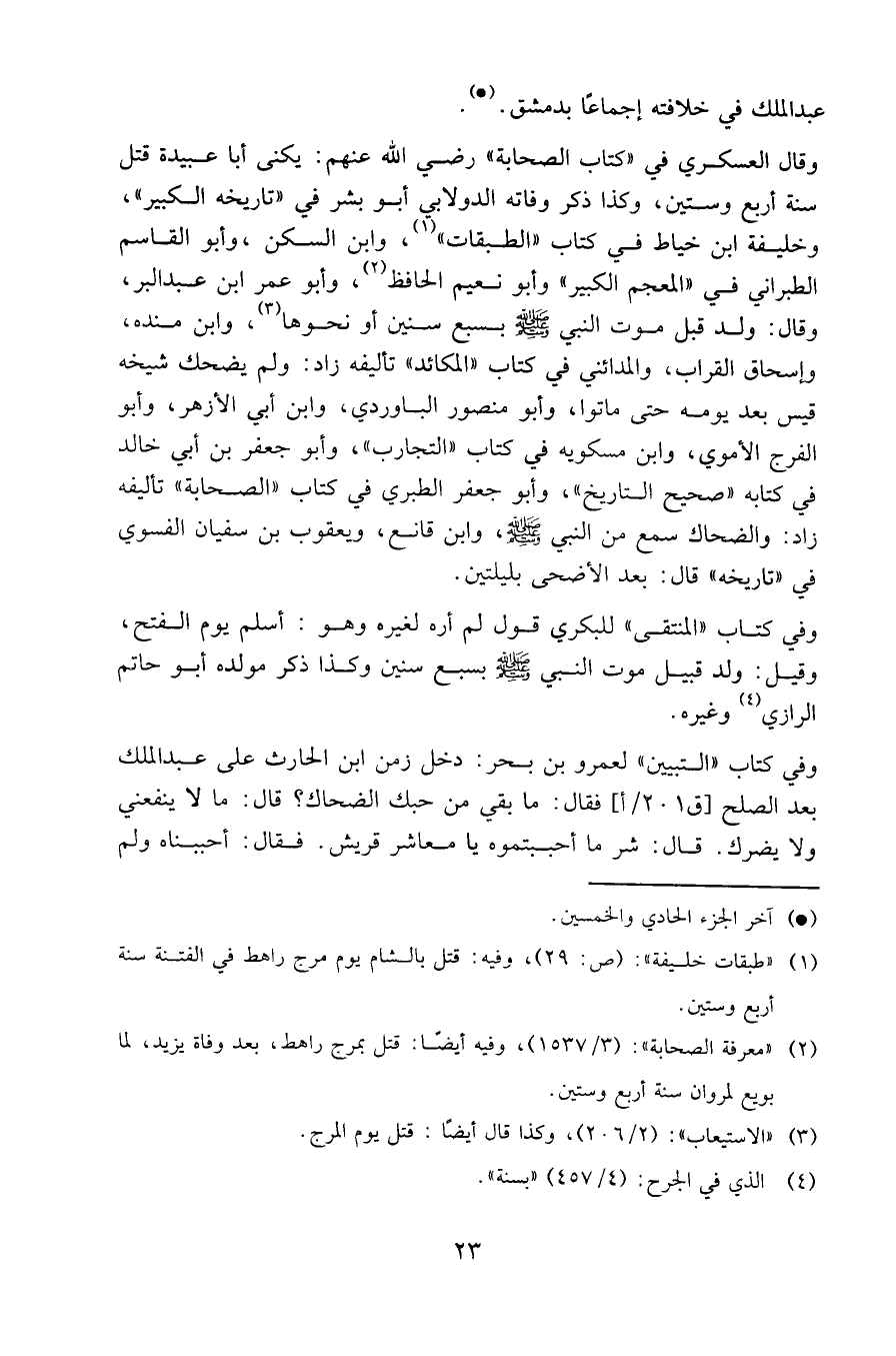 وفي كتاب "المنتقى " للبكري قول لم أره لغيره وهو: أسلم يوم الفتح، وقيل: ولد قبيل موت النبي صلى الله عليه وسلم بسبع سنين وكذا ذكر مولده أبو حاتم الرازي وغيره.