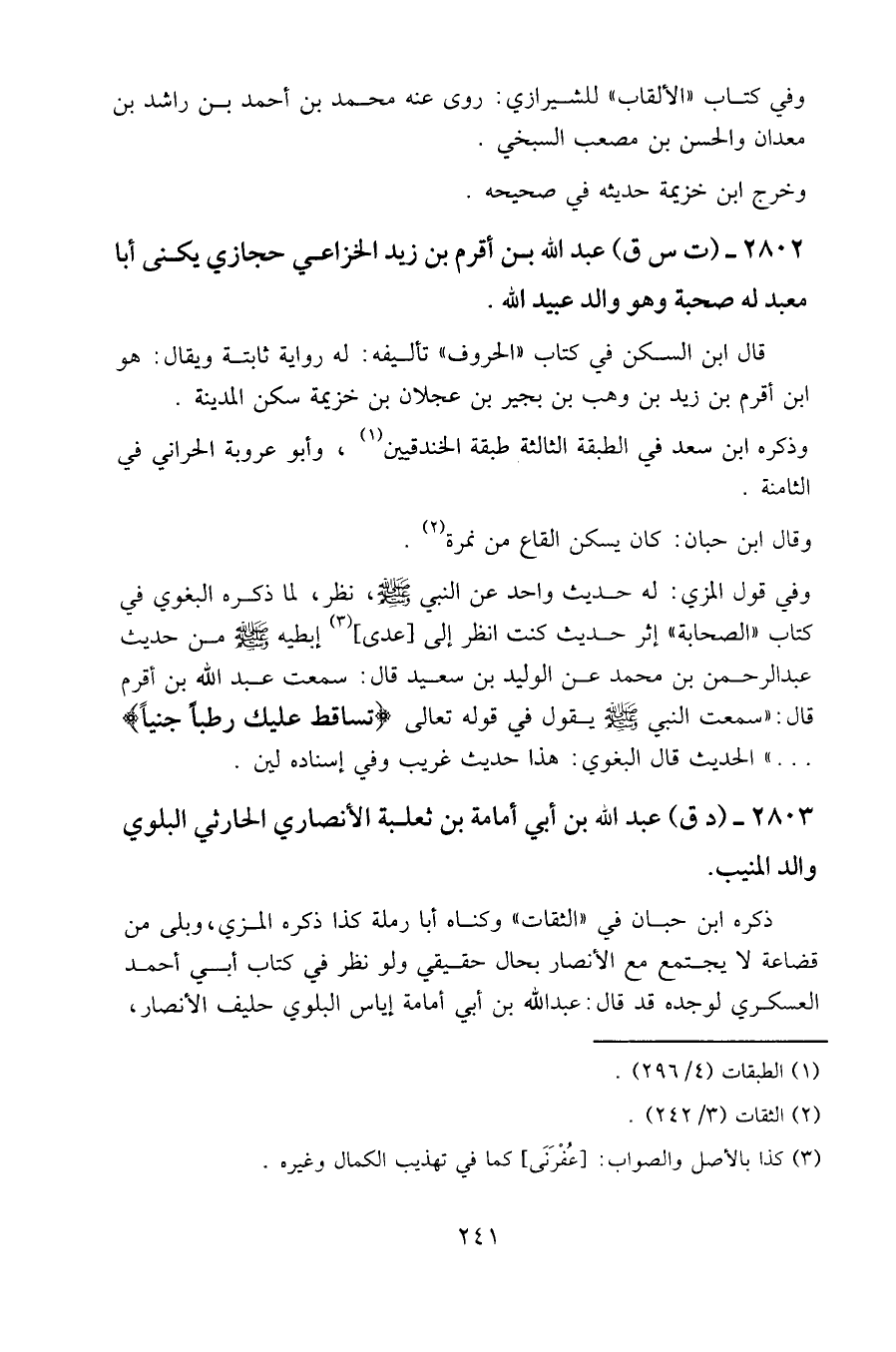 2802 - (ت س ق) عبد الله بن أقرم بن زيد الخزاعي حجازي يكنى أبا معبد له صحبة وهو والد عبيد الله.