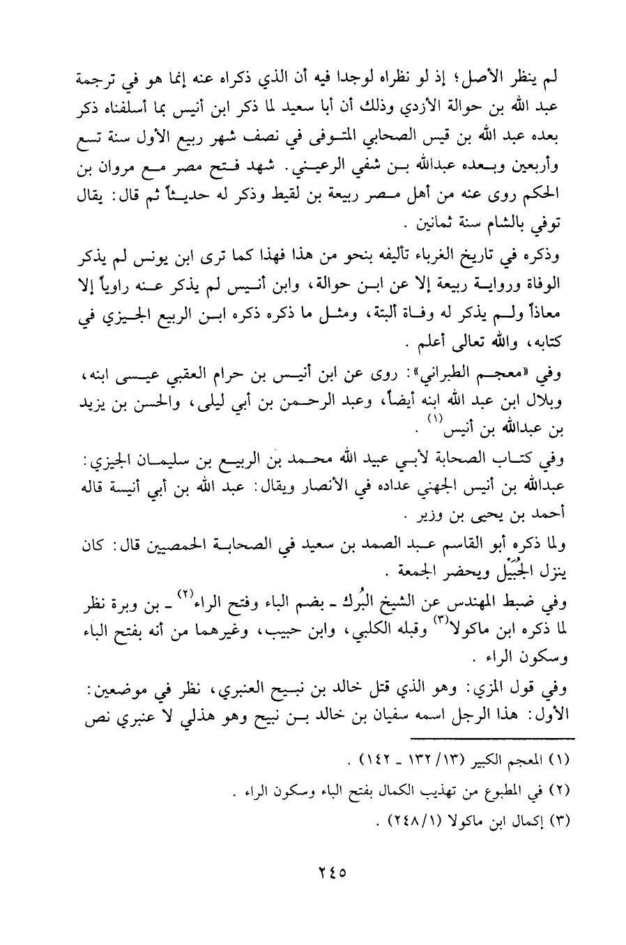 لم ينظر الأصل؛ إذ لو نظراه لوجدا فيه أن الذي ذكراه عنه إنما هو في ترجمة عبد الله بن حوالة الأزدي وذلك أن أبا سعيد لما ذكر ابن أنيس بما أسلفناه ذكر بعده عبد الله بن قيس الصحابي المتوفى في نصف شهر ربيع الأول سنة تسع وأربعين وبعده عبد الله بن شفي الرعيني. شهد فتح مصر مع مروان بن الحكم روى عنه من أهل مصر ربيعة بن لقيط وذكر له حديثا ثم قال: يقال توفي بالشام سنة ثمانين.