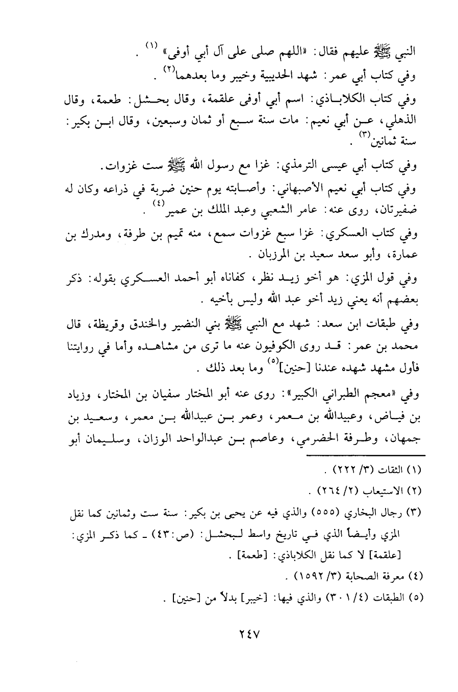 وفي كتاب الكلاباذي: اسم أبي أوفى علقمة، وقال بحشل: طعمة، وقال الذهلي، عن أبي نعيم: مات سنة سبع أو ثمان وسبعين، وقال ابن بكير: سنة ثمانين.