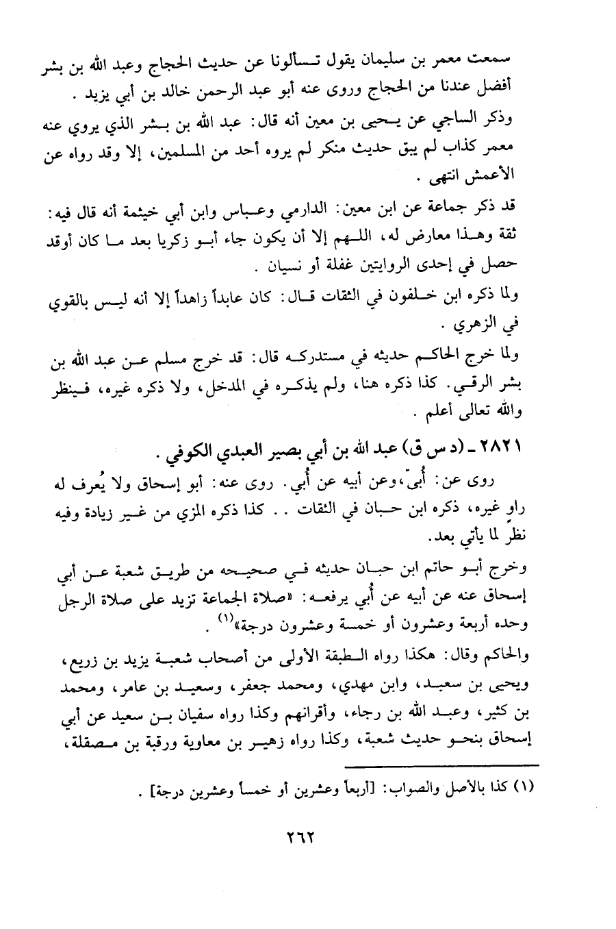 وخرج أبو حاتم بن حبان حديثه في صحيحه من طريق شعبة عن أبي إسحاق عنه عن أبيه عن أبي يرفعه: صلاة الجماعة تزيد على صلاة الرجل وحده أربعة وعشرون أو خمسة وعشرون درجة "