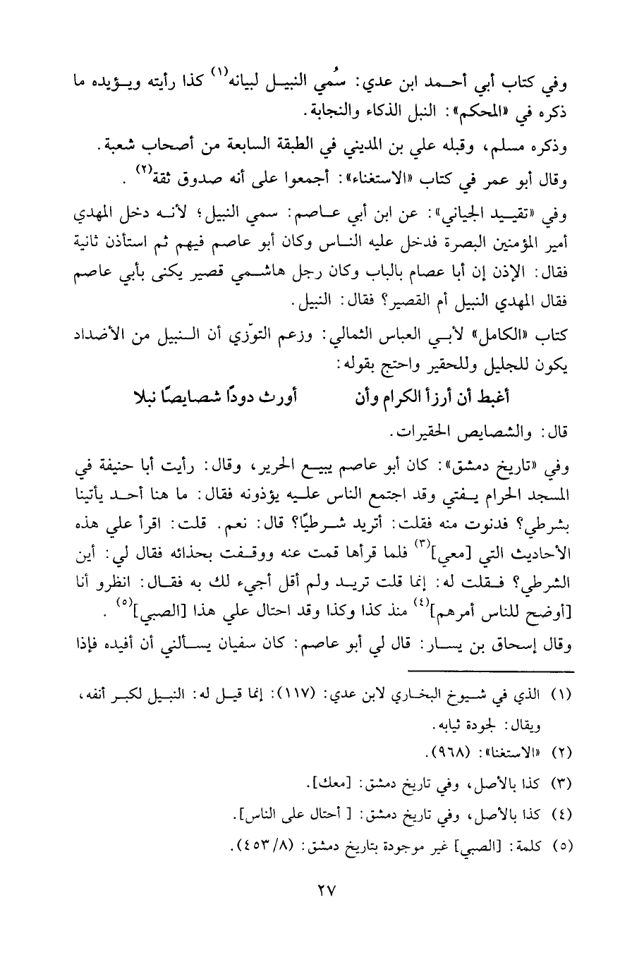 وفي "تقييد الجياني ": عن ابن أبي عاصم: سمي النبيل؛ لأنه دخل المهدي أمير المؤمنين البصرة فدخل عليه الناس وكان أبو عاصم فيهم ثم استأذن ثانية فقال: الإذن إن أبا عصام بالباب وكان رجل هاشمي قصير يكنى بأبي عاصم فقال المهدي النبيل أم القصير؟ فقال: النبيل.