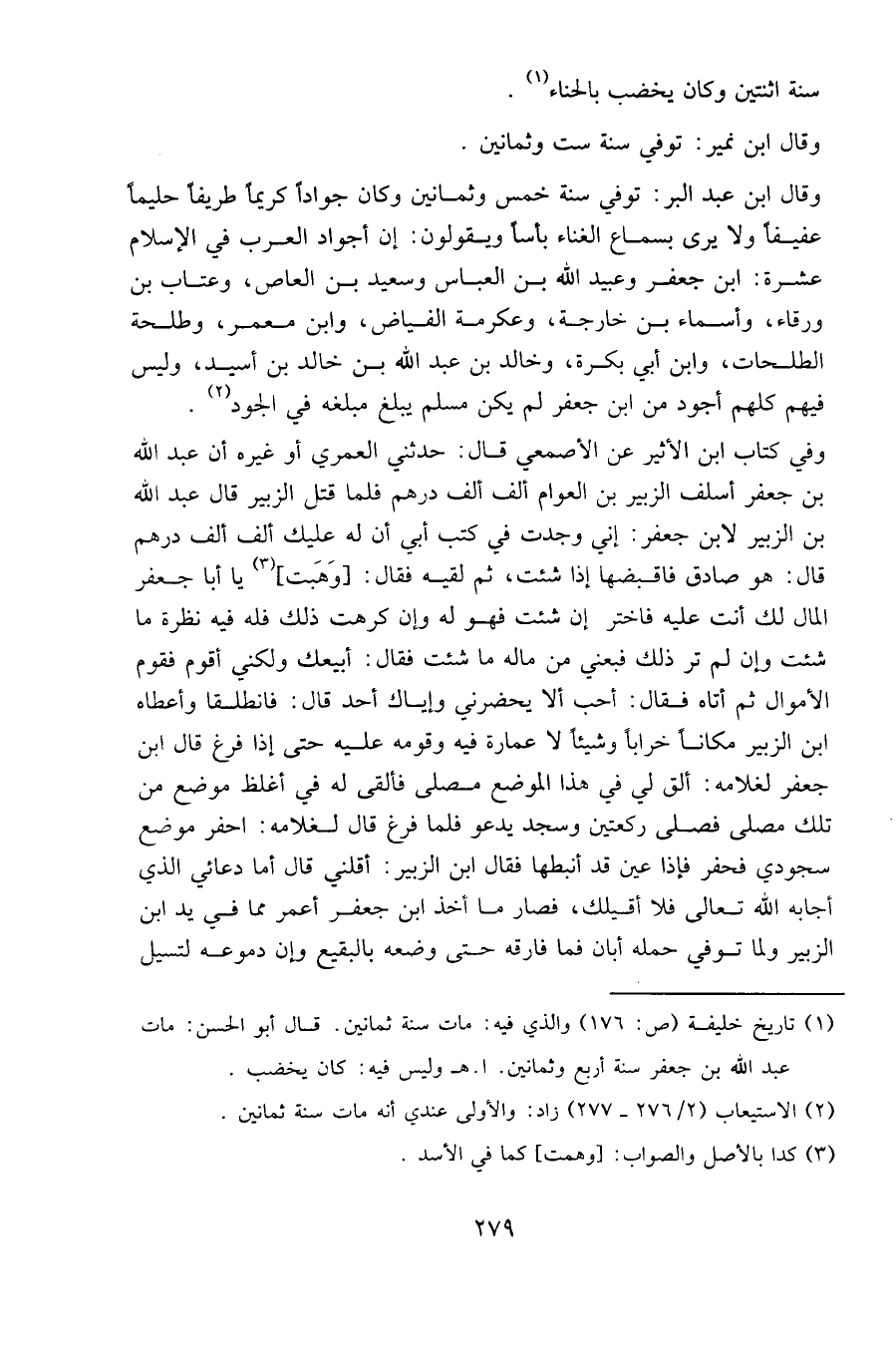 وفي كتاب ابن الأثير عن الأصمعي قال: حدثني العمري أو غيره أن عبد الله بن جعفر أسلف الزبير بن العوم ألف ألف درهم فلما قتل الزبير قال عبد الله بن الزبير لابن جعفر: إني وجدت في كتب أبي أن له عليك ألف ألف درهم قال: هو صادق فاقبضها إذا شئت، ثم لقيه فقال: [وهبت] يا أبا جعفر المال لك أنت عليه فاختر إن شئت فهو له وإن كرهت ذلك فله فيه نظرة ما شئت وإن لم تر ذلك فبعني من ماله ما شئت فقال: أبيعك ولكني أقوم فقوم الأموال ثم أتاه فقال: أحب ألا يحضرني وإياك أحد قال: فانطلقا وأعطاه ابن الزبير مكانا خرابا وشيئا لا عمارة فيه وقومه عليه حتى إذا فرغ قال ابن جعفر لغلامه: ألق لي في هذا الموضع مصلى فألقى له في أغلظ موضع من تلك مصلى فصلى ركعتين وسجد يدعو فلما فرغ قال لغلامه: احفر موضع سجودي فحفر فإذا عين قد أنبطها فقال ابن الزبير: أقلني قال أما دعائي الذي أجابه الله تعالى فلا أقيلك، فصار ما أخذ ابن جعفر أعمر مما في يد ابن الزبير ولما توفي حمله أبان فما فارقه حتى وضعه بالبقيع وإن دموعه لتسيل