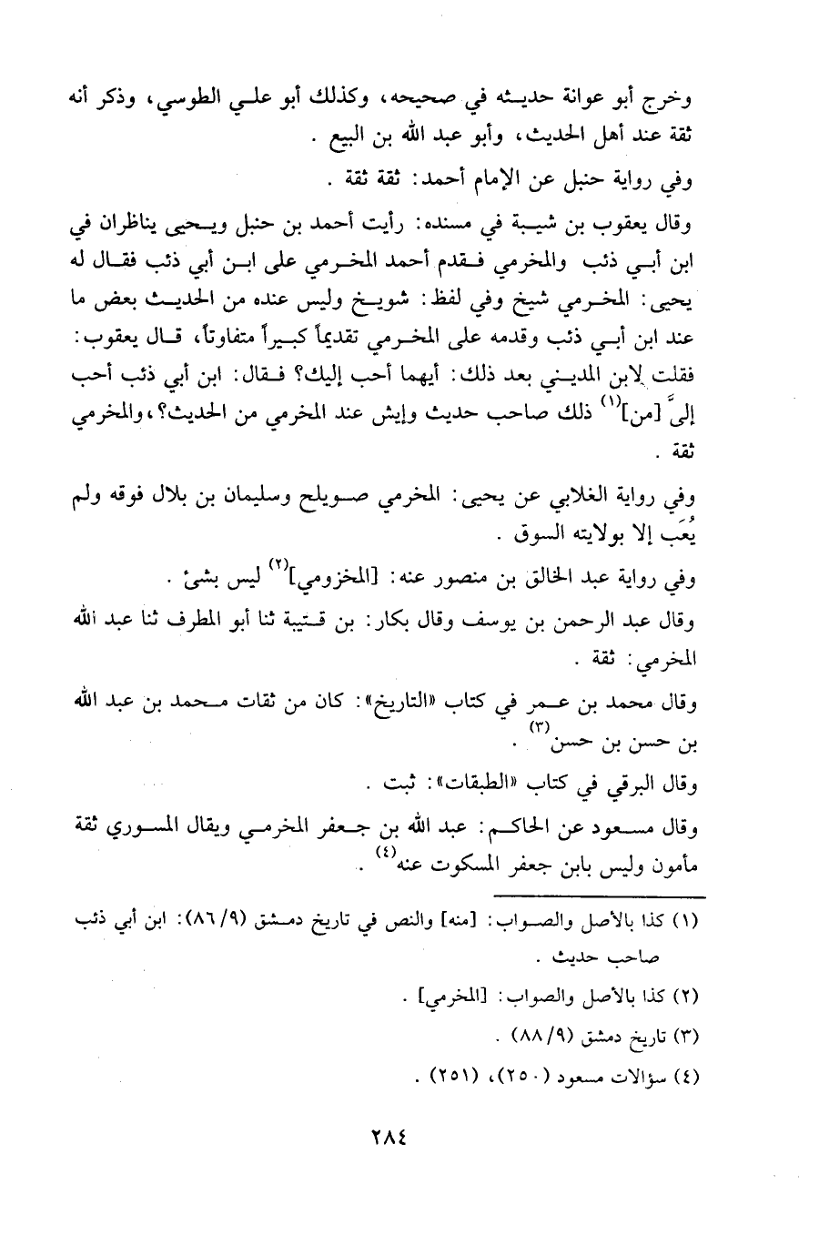وقال عبد الرحمن بن يوسف وقال بكار بن قتيبة حَدَّثنا أبو المطرف حَدَّثنا عبد الله المخرمي: ثقة.