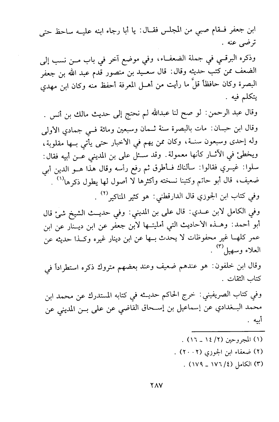 وذكره البرقي في جملة الضعفاء، وفي موضع آخر في باب من نسب إلى الضعف ممن كتب حديثه وقال: قال سعيد بن منصور قدم عبد الله بن جعفر البصرة وكان حافظا قل ما رأيت من أهل المعرفة أحفظ منه وكان ابن مهدي يتكلم فيه.