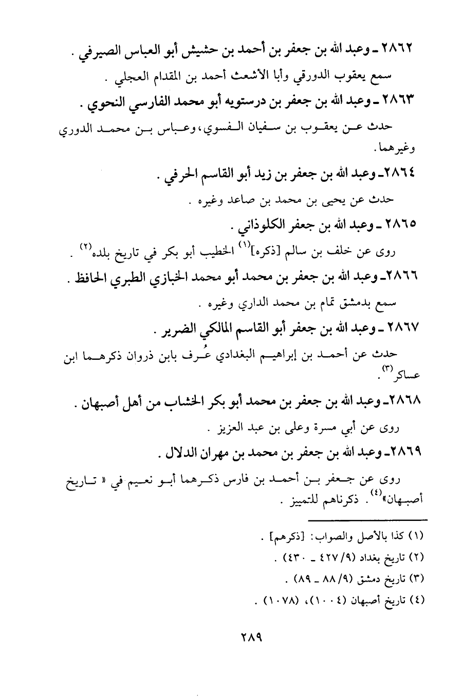 2868- وعبد الله بن جعفر بن محمد أبو بكر الخشاب من أهل أصبهان.