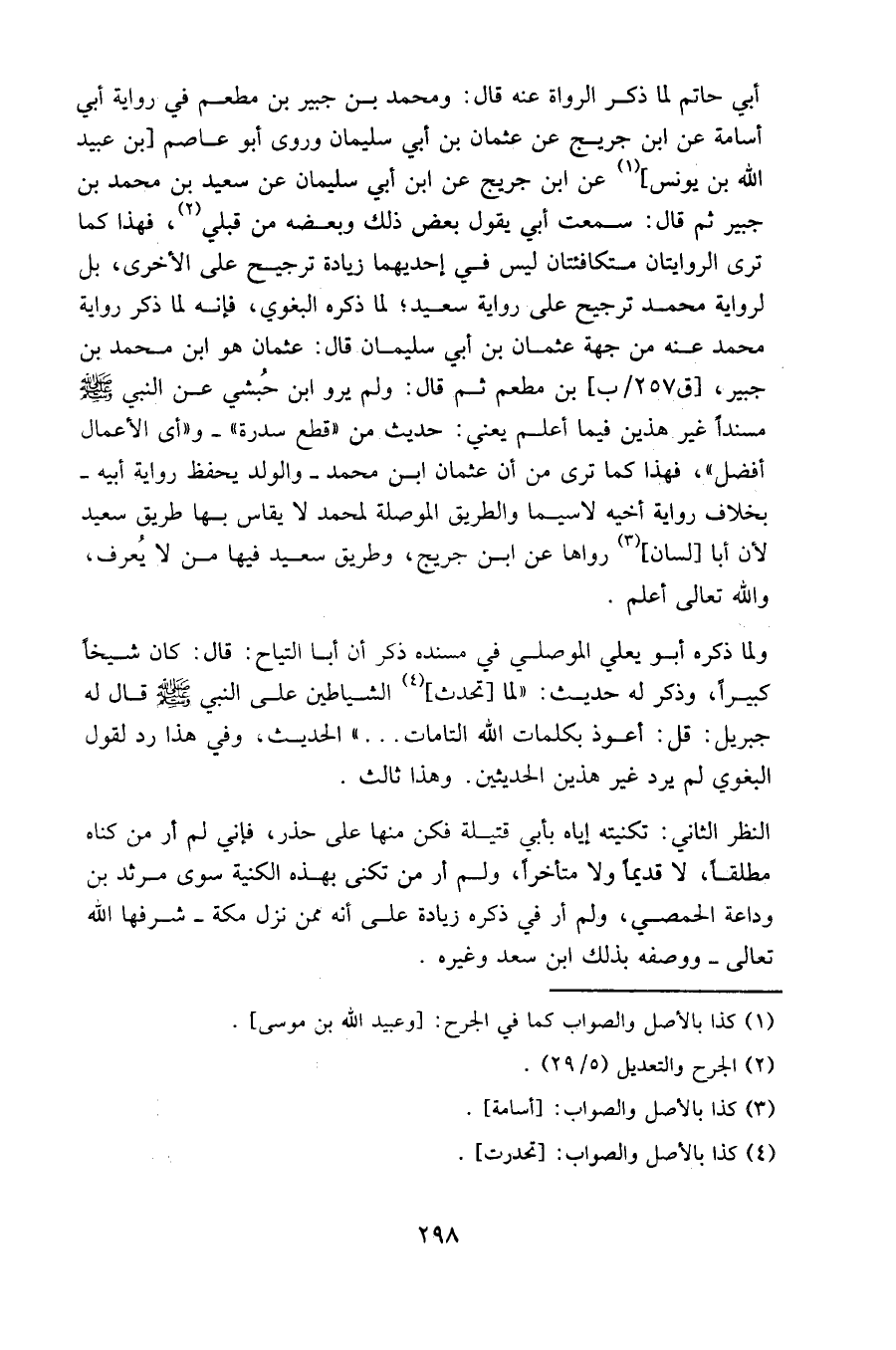 أبي حاتم لما ذكر الرواة عنه قال: ومحمد بن جبير بن مطعم في رواية أبي أسامة عن ابن جريج عن عثمان بن أبي سليمان، وروى أبو عاصم [بن عبيد الله بن يونس] عن ابن جريج عن ابن أبي سليمان عن سعيد بن محمد بن جبير ثم قال: سمعت أبي يقول بعض ذلك وبعضه من قبلي، فهذا كما ترى الروايتان متكافئتان ليس في إحديهما زيادة ترجيح على الأخرى، بل لرواية محمد ترجيح على رواية سعيد؛ لما ذكره البغوي، فإنه لما ذكر رواية محمد عنه من جهة عثمان بن أبي سليمان قال: عثمان هو ابن محمد بن جبير، [ق257/ب] بن مطعم ثم قال: ولم يرو ابن حبشي عن النبي صلى الله عليه وسلم مسندا غير هذين فيما أعلم يعني: حديث من " قطع سدرة" و "أي الأعمال أفضل"، فهذا كما ترى من أن عثمان بن محمد والولد يحفظ رواية أبيه بخلاف رواية أخيه لا سيما والطريق الموصلة لمحمد لا يقاس بها طريق سعيد لأن أبا [لسان] رواها عن ابن جريج، وطريق سعيد فيها من لا يعرف، والله تعالى أعلم.