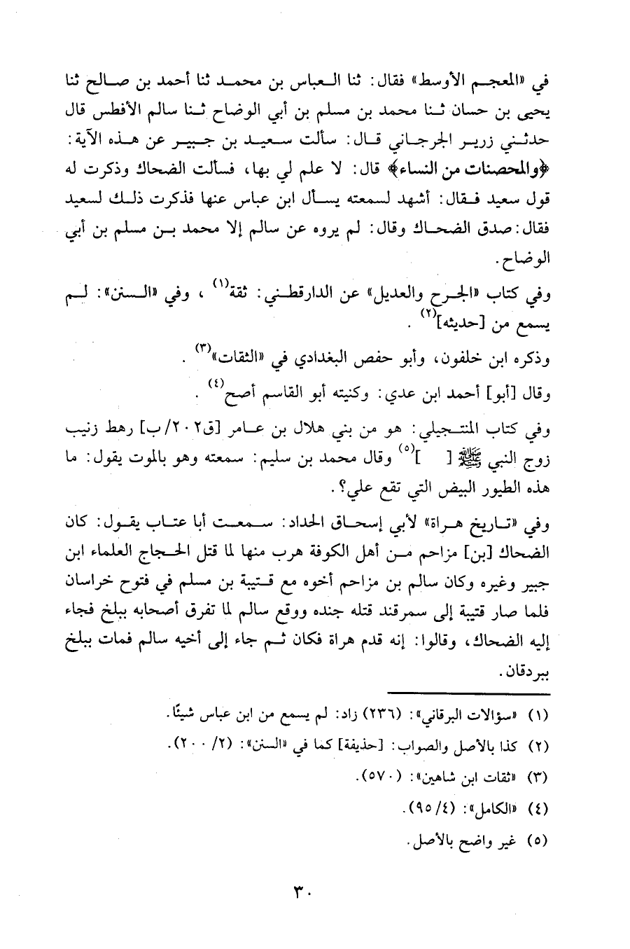 في "المعجم الأوسط " فقال: حَدَّثنا العباس بن محمد حَدَّثنا أحمد بن صالح حَدَّثنا يحيى بن حسان حَدَّثنا محمد بن مسلم بن أبي الوضاح حَدَّثنا سالم الأفطس قال حدثني زرير الجرجاني قال: سألت سعيد بن جبير عن هذه الآية: {والمحصنات من النساء} قال: لا علم لي بها، فسألت الضحاك وذكرت له قول سعيد فقال: أشهد لسمعته يسأل ابن عباس عنها فذكرت ذلك لسعيد فقال: صدق الضحاك وقال: لم يروه عن سالم إلا محمد بن مسلم بن أبي الوضاح.