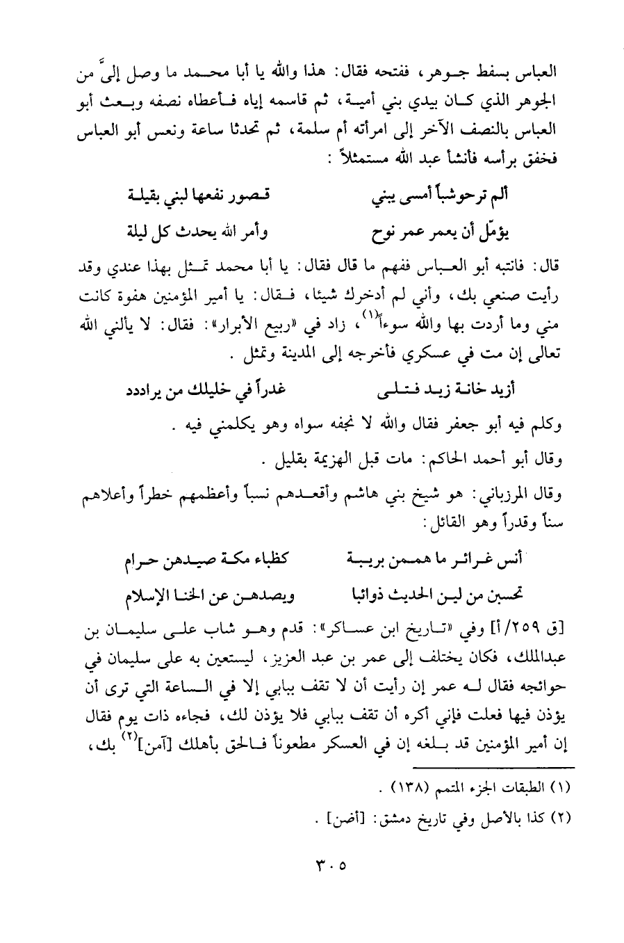 العباس بسفط جوهر، ففتحه فقال: هذا والله يا أبا محمد ما وصل إلي من الجوهر الذي كان بيدي بني أمية، ثم قاسمه إياه فأعطاه نصفه وبعث أبو العباس بالنصف الآخر إلى امرأته أم سلمة، ثم تحدثا ساعة ونعس أبو العباس فخفق برأسه فأنشأ عبد الله مستمثلا: