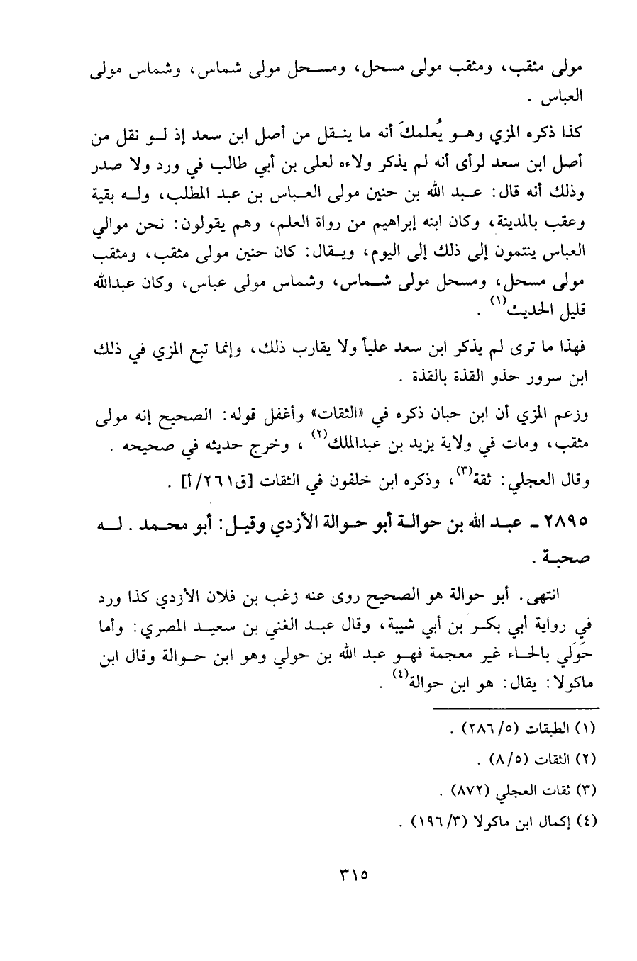 كذا ذكره المزي وهو يعلمك أنه ما ينقل من أصل ابن سعد إذ لو نقل من أصل ابن سعد لرأى أنه لم يذكر ولاءه لعلي بن أبي طالب في ورد ولا صدر، وذلك أنه قال: عبد الله بن حنين مولى العباس بن عبد المطلب، وله بقية وعقب بالمدينة، وكان ابنه إبراهيم من رواة العلم، وهم يقولون: نحن موالي العباس ينتمون إلى ذلك إلى اليوم، ويقال: كان حنين مولى مثقب، ومثقب مولى مسحل، ومسحل مولى شماس، وشماس مولى عباس، وكان عبد الله قليل الحديث.