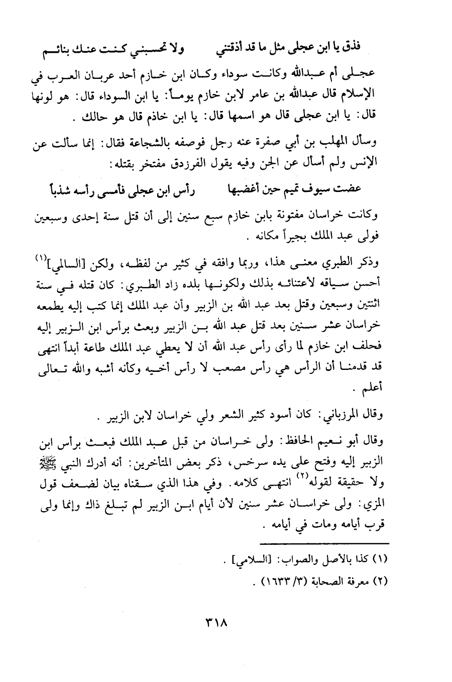 وذكر الطبري معنى هذا، وربما وافقه في كثير من لفظه، ولكن [السالمي] أحسن سياقه لاعتنائه بذلك ولكونها بلده زاد الطبري: كان قتله في سنة اثنتين وسبعين وقتل بعد عبد الله بن الزبير وأن عبد الملك إنما كتب إليه يطعمه خراسان عشر سنين بعد قتل عبد الله بن الزبير وبعث رأس ابن الزبير إليه فحلف ابن خازم لما رأى رأس عبد الله أن لا يعطي عبد الملك طاعة أبدا انتهى قد قدمنا أن الرأس هي رأس مصعب لا رأس أخيه وكأنه أشبه والله تعالى أعلم.