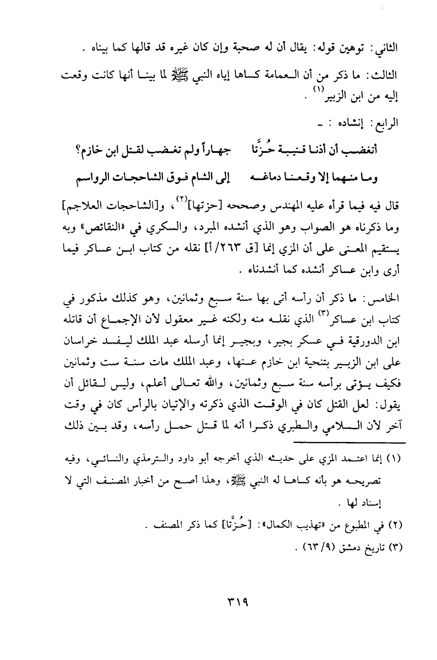قال فيما قرأه عليه المهندس وصححه [حزتها]، و [الشاحجات العلاجم] وما ذكرناه هو الصواب وهو الذي أنشده المبرد، والسكري في "النقائص " وبه يستقيم المعنى على أن المزي إنما [ق 263/أ] نقله من كتاب ابن عساكر فيما أرى وابن عساكر أنشده كما أنشدناه.