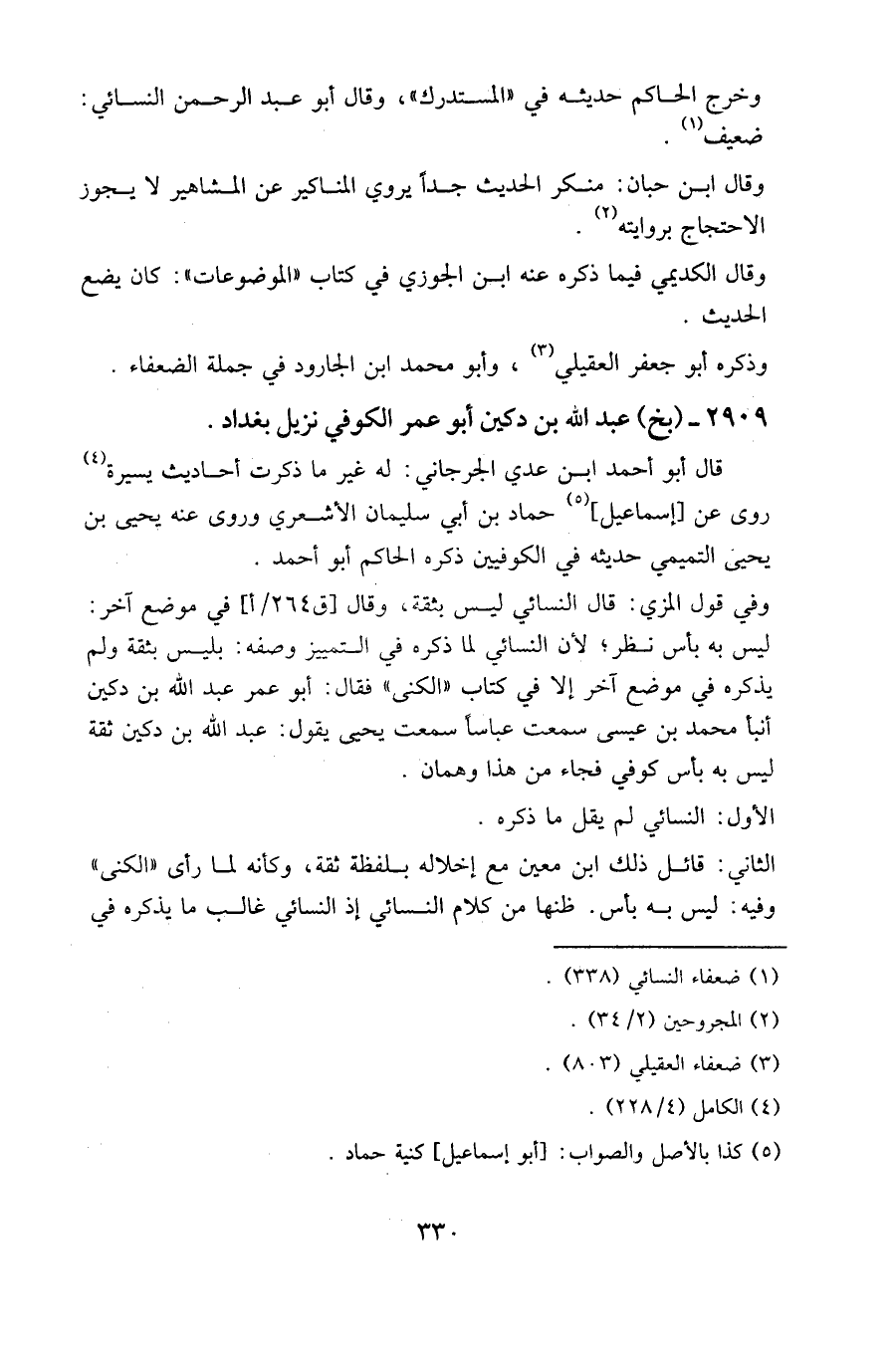 ليس به بأس نظر؛ لأن النسائي لما ذكره في التمييز وصفه: بليس بثقة ولم يذكره في موضع آخر إلا في كتاب "الكنى " فقال: أبو عمر عبد الله بن دكين أنبأ محمد بن عيسى سمعت عباسا سمعت يحيى يقول: عبد الله بن دكين ثقة ليس به بأس كوفي فجاء من هذا وهمان: