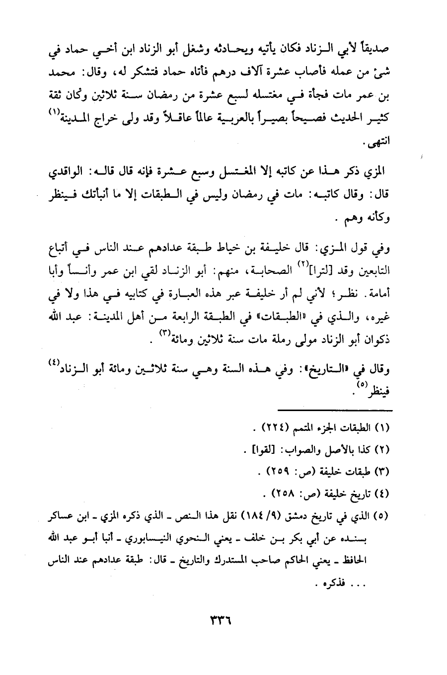 وفي قول المزي: قال خليفة بن خياط طبقة عدادهم عند الناس في أتباع التابعين وقد [لترا] الصحابة، منهم: أبو الزناد لقي ابن عمر وأنسا وأبا أمامة. نظر؛ لأني لم أر خليفة عبر هذه العبارة في كتابيه في هذا ولا في غيره، والذي في "الطبقات " في الطبقة الرابعة من أهل المدينة: عبد الله ذكوان أبو الزناد مولى رملة مات سنة ثلاثين ومِائَة.