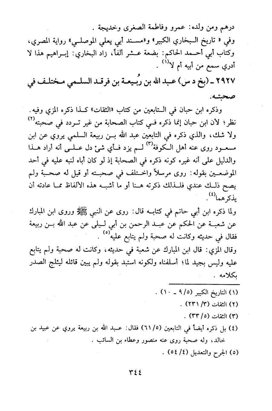 وذكره ابن حبان في التابعين من كتاب "الثقات" كذا ذكره المزي وفيه نظر؛ لأن ابن حبان إنما ذكره في كتاب الصحابة من غير تردد في صحبته ولا شك، والذي ذكره في التابعين عبد الله بن ربيعة السلمي يروي عن ابن مسعود، روى عنه أهل الكوفة، لم يزد فأي شيء دل على أنه أراد هذا والدليل على أنه غيره كونه ذكره في الصحابة إذ لو كان أباه لنبه عليه في أحد الموضعين بقوله: روى مرسلا واختلف في صحبته أو قيل له صحبة ولم يصح ذلك عندي، فلذلك ذكرته هنا أو ما أشبه هذه الألفاظ مما عادته أن يذكرهما.