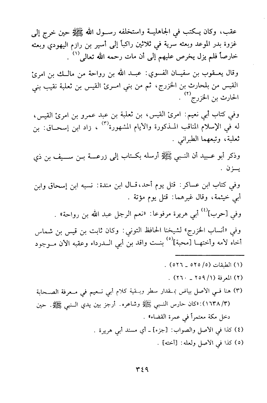 وقال يعقوب بن سفيان الفسوي: عبد الله بن رواحة بن مالك بن امرئ القيس من بلحارث بن الخزرج، ثم من بني امرئ القيس بن ثعلبة نقيب بني الحارث بن الخزرج.