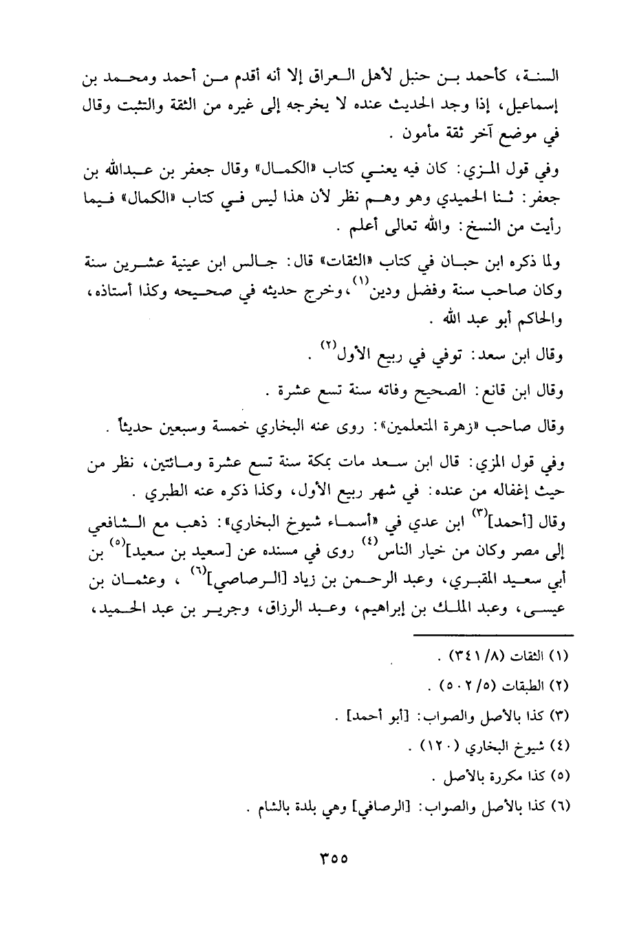 وفي قول المزي: كان فيه يعني كتاب "الكمال " وقال جعفر بن عبد الله بن جعفر: حَدَّثنا الحميدي وهو وهم نظر لأن هذا ليس في كتاب "الكمال " فيما رأيت من النسخ: والله تعالى أعلم.