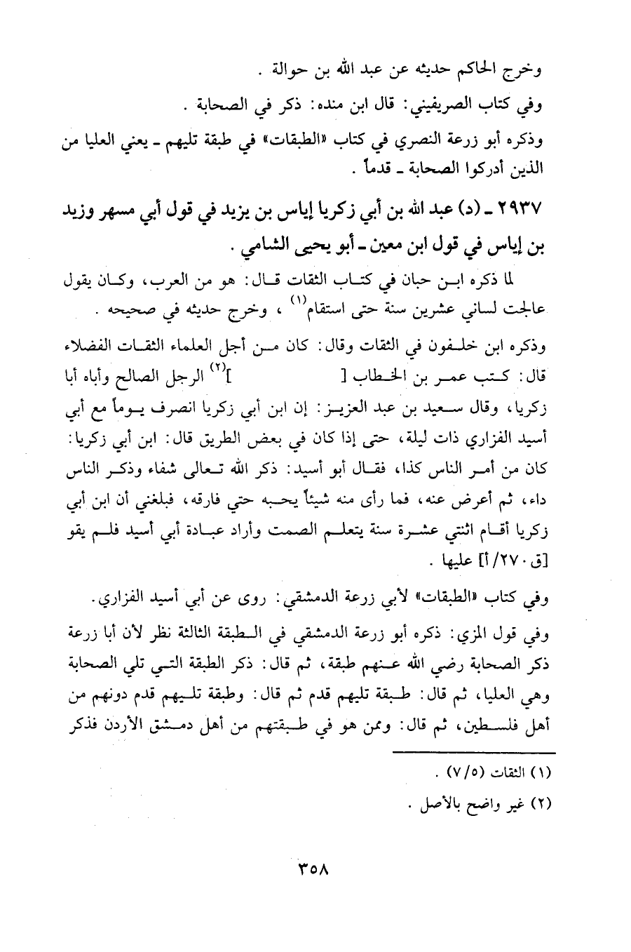 وفي قول المزي: ذكره أبو زرعة الدمشقي في الطبقة الثالثة نظر لأن أبا زرعة ذكر الصحابة رضي الله عنهم طبقة، ثم قال: ذكر الطبقة التي تلي الصحابة وهي العليا، ثم قال: طبقة تليهم قدم ثم قال: وطبقة تليهم قدم دونهم من أهل فلسطين، ثم قال: وممن هو في طبقتهم من أهل دمشق الأردن فذكر