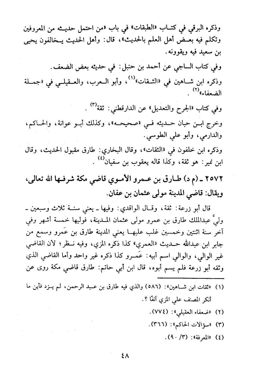 وذكره ابن خلفون في "الثقات"، وقال البخاري: طارق مقبول الحديث، وقال ابن نمير: هو ثقة، وكذا قاله يعقوب بن سفيان.