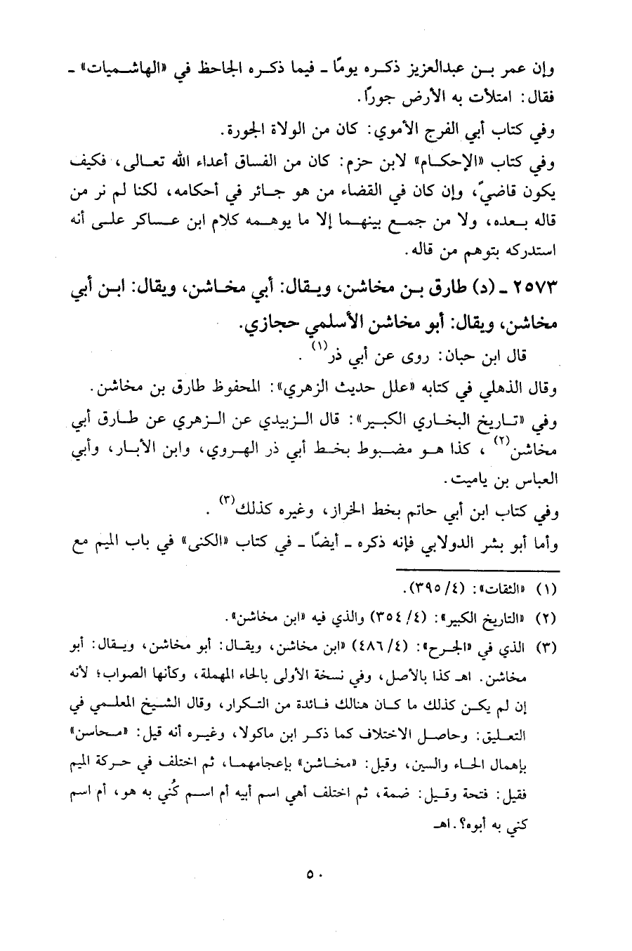 وفي "تاريخ البخاري الكبير ": قال الزبيدي عن الزهري عن طارق أبي مخاشن، كذا هو مضبوط بخط أبي ذر الهروي، وابن الأبار، وأبي العباس بن ياميت.