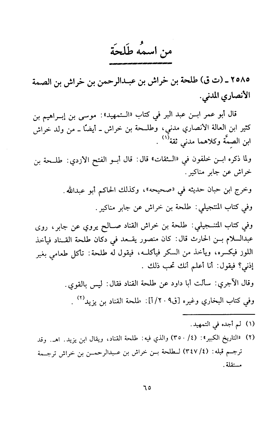 2585- (ت ق) طلحة بن خراش بن عبد الرحمن بن خراش بن الصمة الأنصاري المدني.