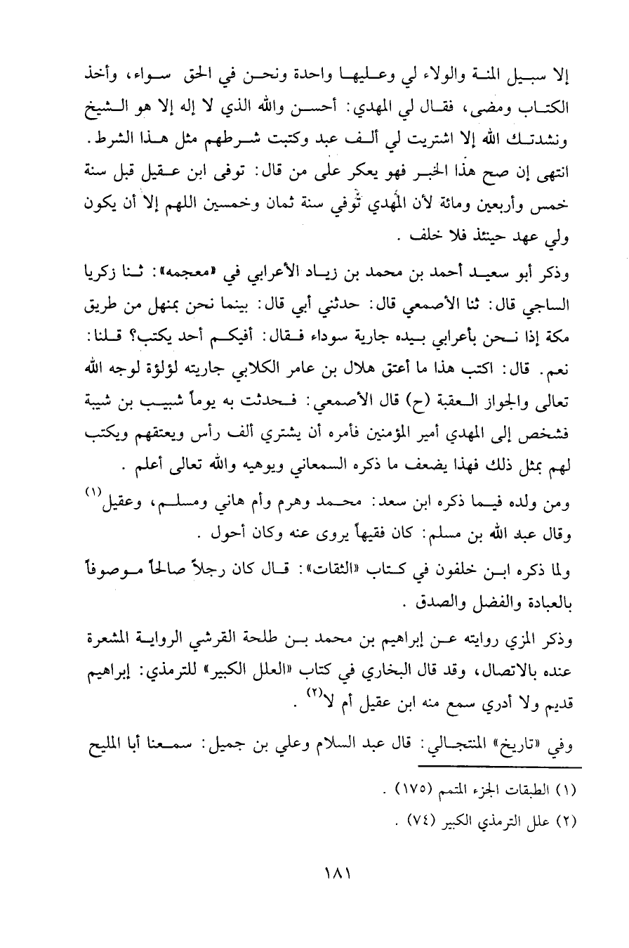 لا سبيل المنة والولاء لي وعليها واحدة ونحن في الحق سواء، وأخذ الكتاب ومضى، فقال لي المهدي: أحسن والله الذي لا إله إلا هو الشيخ ونشدتك الله إلا اشتريت لي ألف عبد وكتبت شرطهم مثل هذا الشرط.