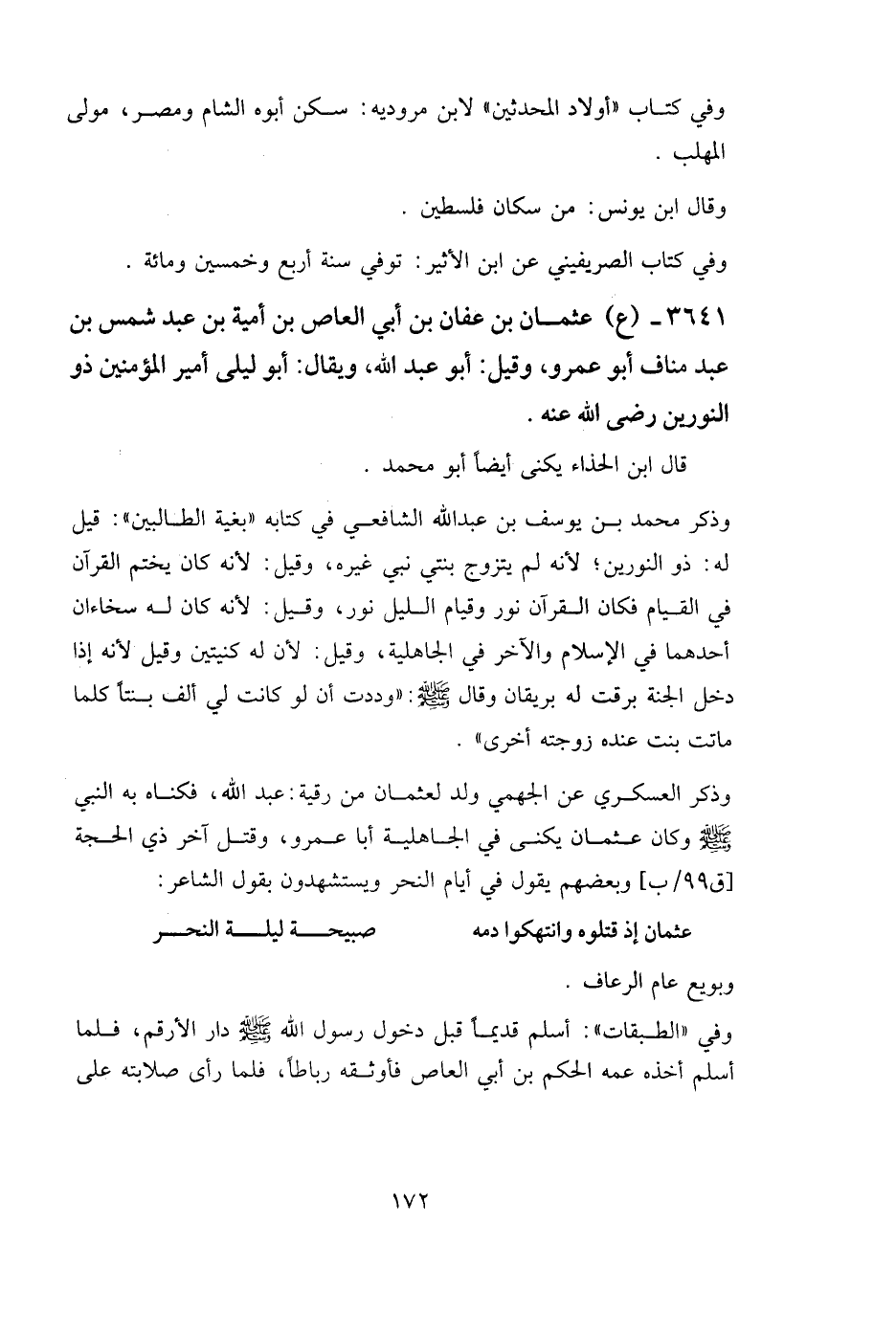 3641- (ع) عثمان بن عفان بن أبي العاص بن أمية بن عبد شمس بن عبد مناف أبو عمرو، وقيل: أبو عبد الله، ويقال: أبو ليلى أمير المؤمنين ذو النورين رضي الله عنه.