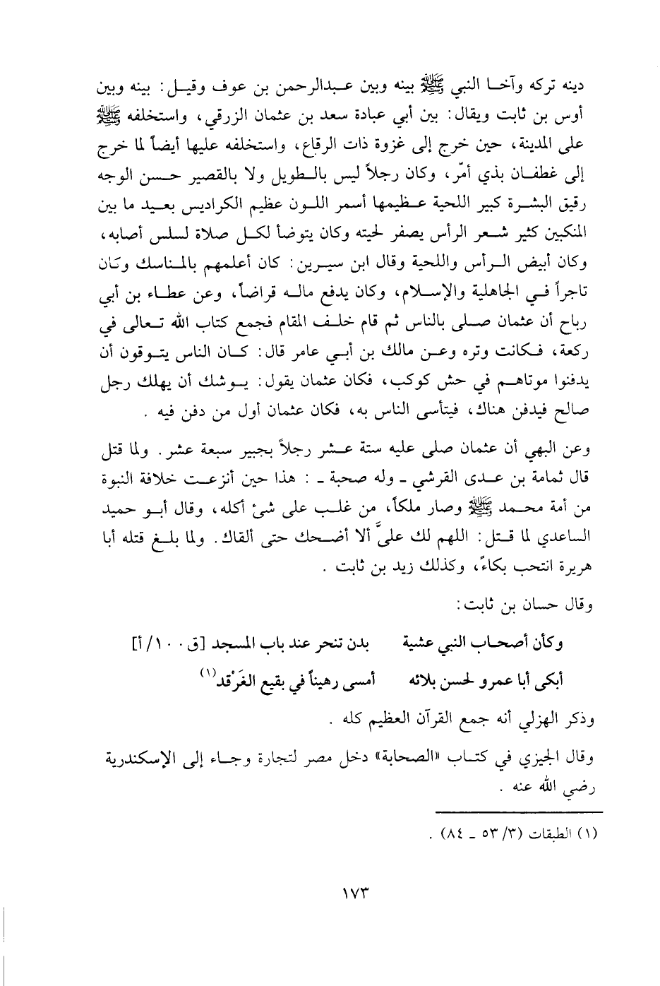 دينه تركه، وآخا النبي صَلى الله عَليه وسَلم بينه وبين عبد الرحمن بن عوف، وقيل: بينه وبين أوس بن ثابت، ويقال: بين أبي عبادة سعد بن عثمان الزرقي، واستخلفه صَلى الله عَليه وسَلم على المدينة، حين خرج إلى غزوة ذات الرقاع، واستخلفه عليها أيضا لما خرج إلى غطفان بذي أمر، وكان رجلا ليس بالطويل ولا بالقصير حسن الوجه رقيق البشرة كبير اللحية عظيمها، أسمر اللون عظيم الكراديس بعيد ما بين المنكبين، كثير شعر الرأس يصفر لحيته، وكان يتوضأ لكل صلاة لسلس أصابه، وكان أبيض الرأس واللحية،