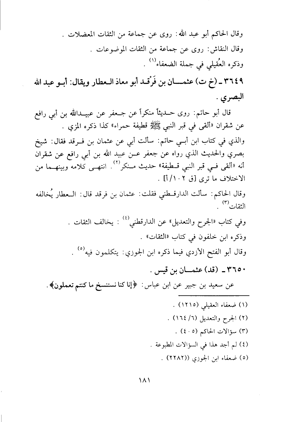 والذي في كتاب ابن أبي حاتم: سألت أبي عن عثمان بن فرقد، فقال: شيخ بصري والحديث الذي رواه عن جعفر عن عبيد الله بن أبي رافع عن شقران أنه " ألقى في قبر النبي قطيفة " حديث منكر. انتهى كلامه وبينهما من الاختلاف ما ترى [ق 102/أ].